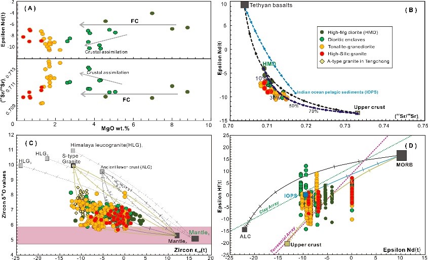 针对上述科学问题,437bwin必赢国际官网“岩石学与地幔地球化学学科团队”朱韧之博士及其合作者选择了位于研究全球造山演化过程最典型地区之一的青藏高原东南缘地区的孟连岩基进行上述科学问题的识别约束。孟连岩基主要由一系列早白垩世高镁闪长岩、钠质花岗闪长岩-英云闪长岩和二长花岗岩组成,我们对这些岩石进行地球年代学、地球化学和同位素约束后发现:(1)高镁闪长岩、英云闪长岩-花岗闪长岩到花岗岩形成于125-115Ma,在10个百万年之内产生,是典型大陆弧背景下的产物,随着K2O/Na2O比值的不断增加,SiO2、K2O, 、Rb、Th含量也不断增加(图1),而MgO、CaO和Sr含量却不断减少,指示了随着岩浆演化作用的进行岩石中富含越来越多的不相容元素;(2)所有岩石样品都显示出高的δ18O值和Nd-Hf解耦特征(图1),结合高的Th/La、Th/Yb和低的Lu/Hf等比值,这被认为是俯冲沉积物(以陆源沉积物为主)交代地幔楔形成的:(3)分离结晶-同化混染(AFC)过程和总体抽离过程在岩浆演化中扮演者重要角色(图2)