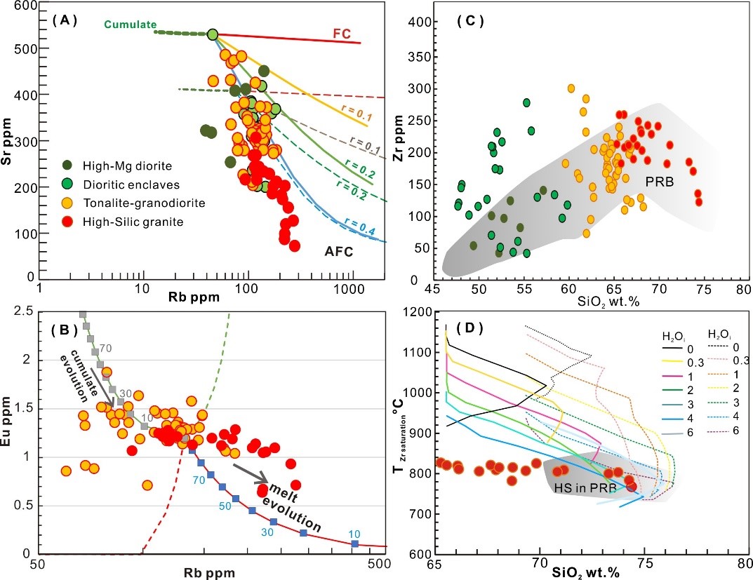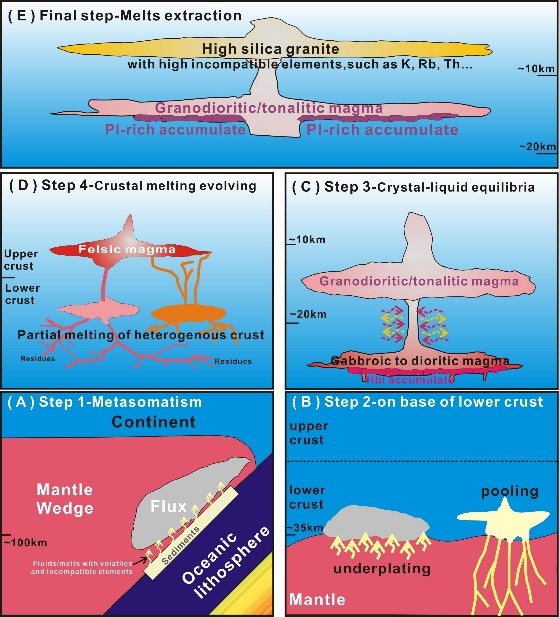 众所周知,大陆地壳的存在是地球这颗星球最显著的特征之一,花岗质岩石代表了大陆地壳的最主要成分,也作为首要证据记录了大陆地壳形成演化的过程。其中地球早期的太古代TTG记录了地球最早时期大陆地壳的形成,也代表了早期大陆地壳最主要成分,以钠质花岗闪长岩-英云闪长岩-奥长花岗岩组合为主,可以通过镁铁质下地壳熔融产生。因此,有科学家认为这些钠质(K2O/Na2O ≤ 0.6)花岗岩代表了地球最早时期岩浆海的坚硬外壳,代表了最原始大陆地壳的组成部分,地球化学特征表现为钙碱性-准铝质-相对高的Fe、Mg和Ca元素含量以及亏损的放射性同位素组成和低的δ18O同位素组成。随着地球进过漫长演化,科学家证实安山质岩石是大陆地壳的主要组成,这些岩石主要是在开放体系下形成的,包括从地幔岩浆的上涌,到不同程度的壳内分异熔融,以及后来的风化作用。一直到现在,我们发现地球大陆地壳的出现了越来越多的富钾花岗岩(K2O/Na2O ratios ≥ 1.0),以含有高含量不相容元素为特征,比如高的K,Rb和Th含量, 低的镁铁质组分,非常演化的放射性同位素组成以及高的δ18O同位素组成。科学家发现这种富含不相容元素的高硅花岗岩的形成主要是由于在浅部岩浆房内钠质花岗闪长岩-英云闪长岩进过高分异作用既晶体沉降和熔体抽取过程形成。我们同时发现:很多科学家认为再循环地壳物质通过俯冲作用与地幔楔进行壳幔相互作用也可以很好解释其衍生岩浆具有高的不相容元素组成和“地壳特征”的同位素组成。可见,“肥沃”且“成熟”的现代大陆地壳不是一蹴而就的,是进过一系列漫长复杂演化过程共同导致的。那么从初始地幔镁铁质岩浆的产生到上地壳富钾高硅花岗岩的形成,现代大陆地壳到底如何变的越来越成熟呢?