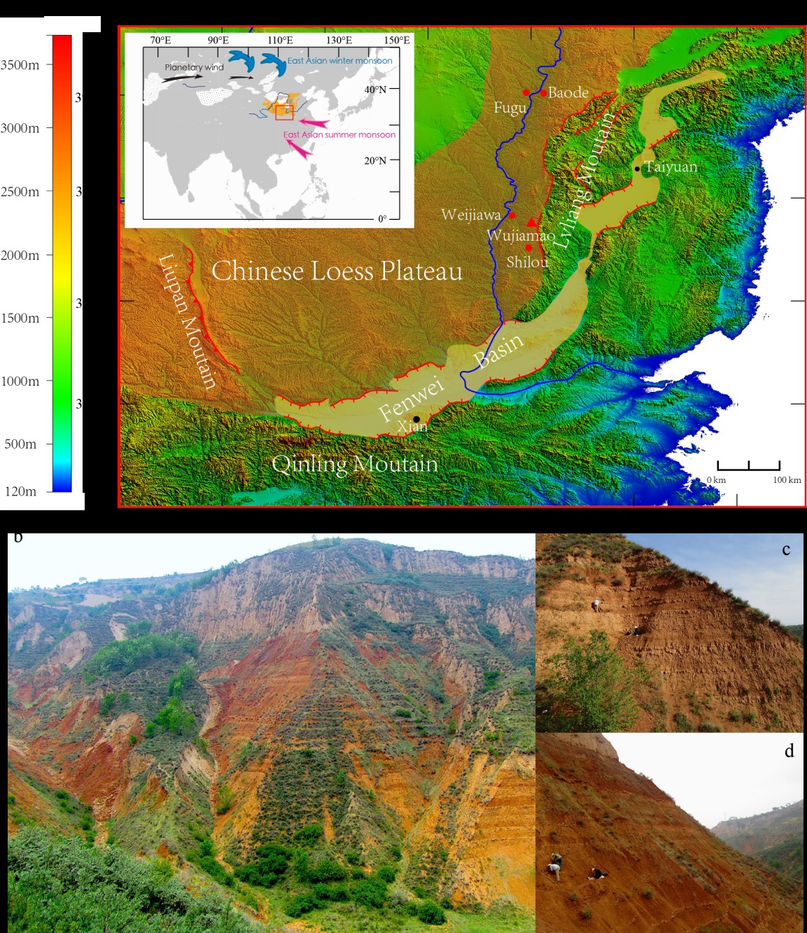 1:(a) 黄土高原地区地形图展示主要构造特征及研究剖面位置。b-d,研究剖面实地照片