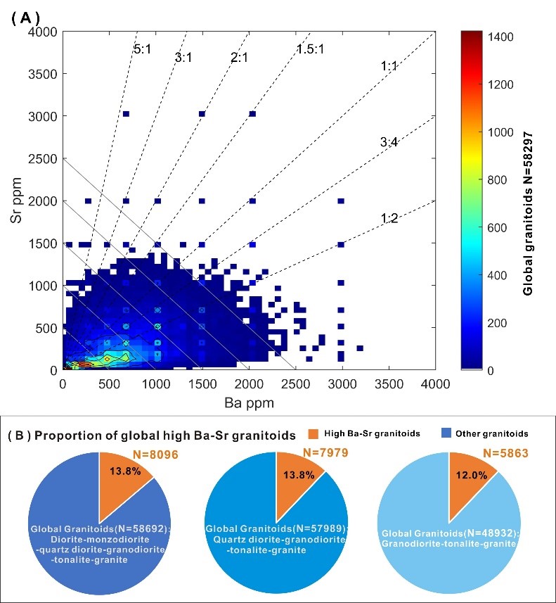 3 全球花岗岩类Ba-Sr含量演化图及高Ba-Sr花岗岩占比(数据具Gard et al. 2019)。