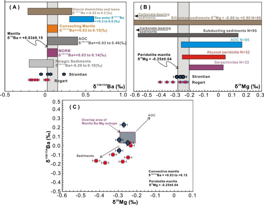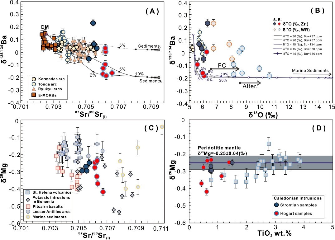 研究还发现,这套苏格兰加里东期古生代的高Ba-Sr侵入岩具有与秦岭造山带富水镁铁质侵入岩完全不同的Ba-Mg同位素特征,前者代表了典型俯冲沉积物熔体交代地幔楔橄榄岩部分熔融的弧岩浆产物,后者则代表了典型混杂岩部分熔融的弧岩浆产物。这说明Ba-Mg同位素联合使用可以有效示踪俯冲带弧岩浆成因过程。