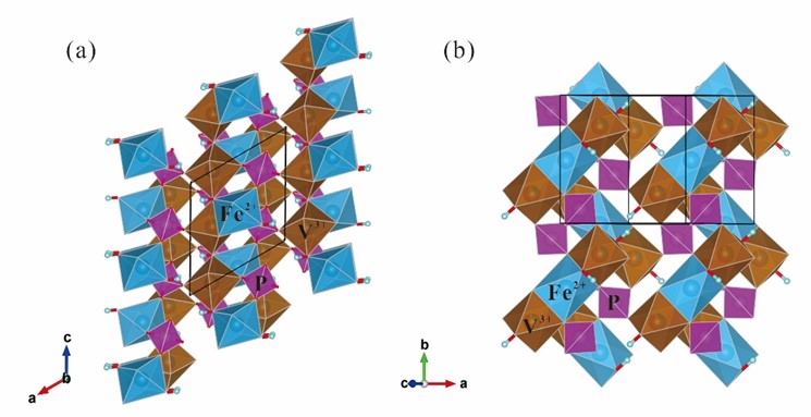 天蓝石(lazulite)是一种稀有矿物,蓝色透明的被用作宝石。梅州天蓝石为天蓝石族的新成员,理想分子式为Fe2+V3+2(PO4)2(OH)2,呈半透明,为青蓝色、褐色,呈他形粒状、板状或柱状,粒径约5至50微米之间,与黄铜矿、方铅矿、闪锌矿等矿物共生(图1)。梅州天蓝石的晶体结构与天蓝石族其他矿物的相似,为单斜晶系,空间群为:P21/C(#14)。V-O八面体共角顶连接成平行于C轴的链(图2),两个V-O八面体与一个Fe-O八面体共棱和共面组成八面体群,八面体群与八面体群及[PO4]四面体通过角顶相连接。