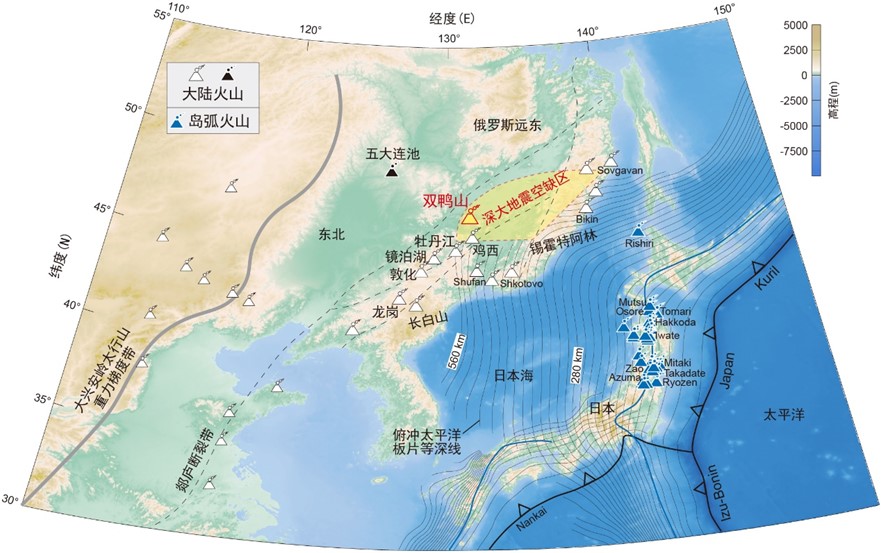图1 东亚新生代火山分布与俯冲太平洋板片的空间关系