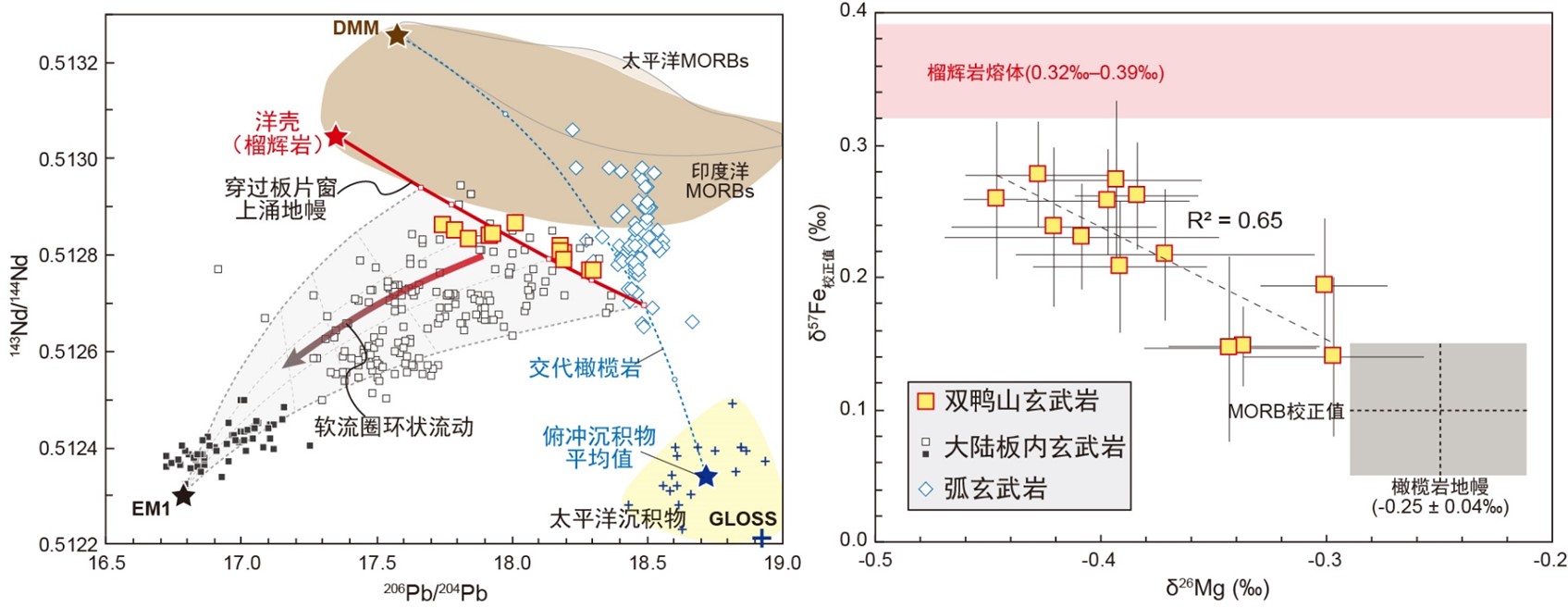 研究结果显示双鸭山玄武岩在稳定同位素组成上具有显著偏高的δ57Fe和偏低的δ26Mg值以及独特的放射成因Pb-Nd同位素组成(图2),在元素组成上则具有偏高的Gd/Yb比值和偏低的Ti/Eu,CaO/Al2O3比值。这些地球化学指标表明双鸭山玄武岩的上地幔源区存在再循环的俯冲太平洋洋壳组分——榴辉岩。与此同时,近震S波分裂分析结果揭示出一个与板片窗相关的上地幔环状流,表明含有板片碎片的地幔上涌流在上地幔中转变为向周围地区的环状流动,从而引发周围地区广泛的板内岩浆作用。初步的地球化学和地球物理检验表明,东亚地区的大多数新生代玄武岩可能与滞留板片在地幔过渡带中的撕裂过程有关。这项研究为大陆玄武岩的起源机制提出了一个“滞留板片撕裂诱发地幔上涌”的地球动力学模型,即俯冲过程引起滞留板片发生撕裂,诱发地幔上涌。该过程导致俯冲到地幔过渡带的洋壳(榴辉岩)随地幔上涌流返回上地幔并减压熔融,从而在大陆内部引发火山作用(图3)。
