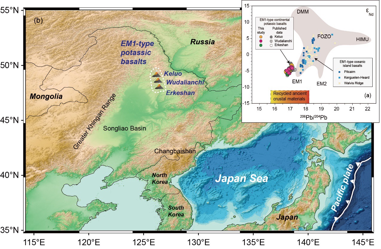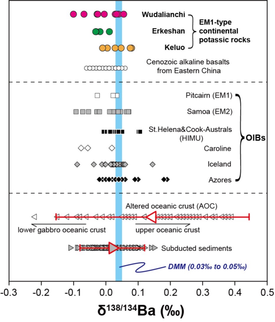 地球深部的化学组成是地幔地球化学的核心研究内容,前人通过对洋岛玄武岩(如Pitcairn岛、Tristan-Gough群岛等)的研究识别出EM1型富集地幔端元,这些玄武岩以极低的206Pb/204Pb和143Nd/144Nd比值为特征,但由于地幔柱的整体熔融程度较高且大洋岩石圈厚度较薄,洋岛玄武岩的EM1组分特征在岩浆形成过程中容易被稀释,传统的地球化学手段难以识别,其成因始终存在争议。中国东北地区松辽盆地西北侧的新生代钾质玄武岩具有极端的放射性成因同位素组成特征(图1),被认为是EM1型洋岛玄武岩的大陆等同组分。并且大陆岩石圈厚度大,大陆玄武岩的地幔熔融程度较低,更有利于保留EM1富集端元组分的信息。钡(Ba)是大离子亲石元素,在地幔部分熔融过程中高度不相容。前人研究表明,Ba同位素在低温环境和流体作用下分馏显著,而在高温过程中分馏有限,可以作为示踪地壳物质俯冲再循环的新工具。