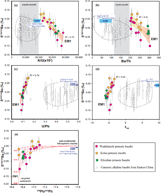 为了进一步对EM1富集端元组分的成因进行限定,437bwin必赢国际官网陈立辉教授课题组对东北地区新生代钾质玄武岩进行了系统的Ba同位素研究。结果表明,EM1型大陆钾质玄武岩的δ138/134Ba(−0.1‰至0.08‰)明显低于亏损地幔值(DMM;δ138/134Ba=0.03‰至0.05‰)(图2),且其与K/U、Ba/Th、U/Pb、εNd、206Pb/204Pb存在明显相关性,呈现出两端元混合的趋势(图3)。其中,EM1型富集地幔端元具有较轻的Ba同位素,这一现象不是由于地壳混染、岩浆期后蚀变、分离结晶、部分熔融等过程导致(详见原文)。在排除了蚀变洋壳的可能性之后,研究团队认为轻Ba同位素主要反映了俯冲沉积物组分的贡献(图3)。结合主微量元素、其他同位素以及定量计算表明,上述独特的Ba同位素特征来源于再循环沉积物派生熔体与地幔橄榄岩的相互作用。上述研究表明,EM1型大陆玄武岩保留了源区再循环古老沉积物中Ba同位素特征,证实了Ba同位素具有示踪地壳物质再循环的潜力。