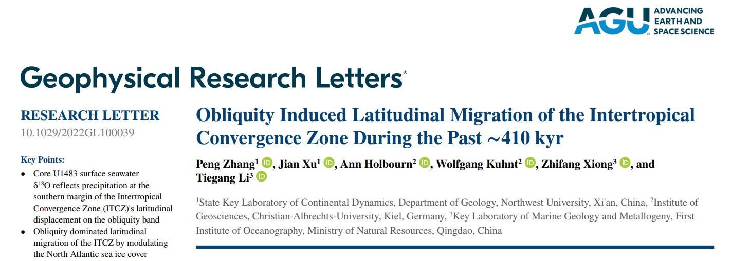 近日,美国地球物理学会(American Geophysical Union, AGU)旗舰、Nature Index(NI)期刊《Geophysical Research Letters》发表了437bwin必赢国际官网古海洋学团队的最新研究成果《Obliquity Induced Latitudinal Migration of the Intertropical Convergence Zone During the Past ∼410 kyr》。
