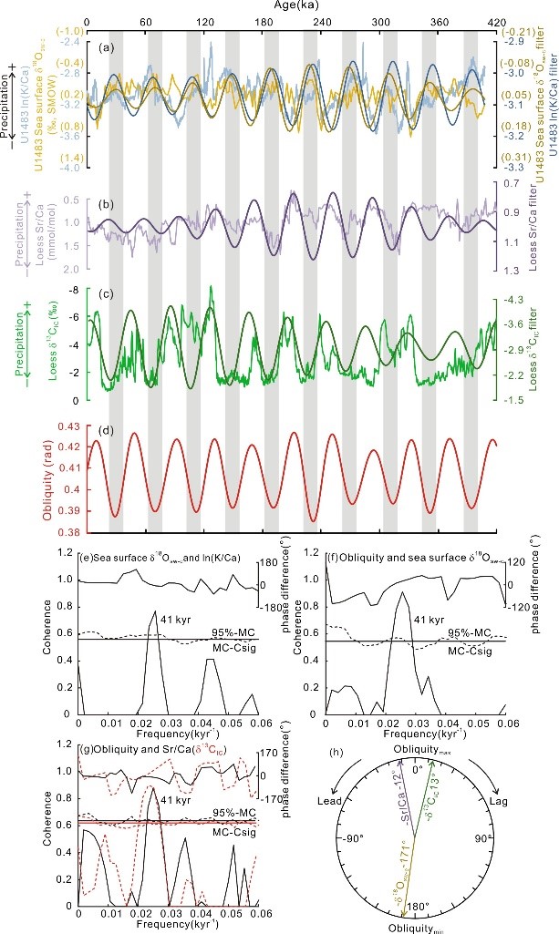 鉴于此,该团队以“国际大洋发现计划”(International Ocean Discovery Program, IODP)第363航次在印-太暖池西南边缘U1483站处钻取的深海岩芯沉积物为研究材料,通过对浮游有孔虫表层水种Globigerinoides ruber壳体进行d18O和Mg/Ca比值分析,重建了过去41万年热带辐合带南缘处的降雨记录。与基于中国黄土重建的位于热带辐合带北缘处的降雨记录进行对比显示,热带辐合带南、北缘的降雨在斜率周期上呈反相位变化(图1),表明过去41万年热带辐合带的纬向迁移受地球斜率的支配。