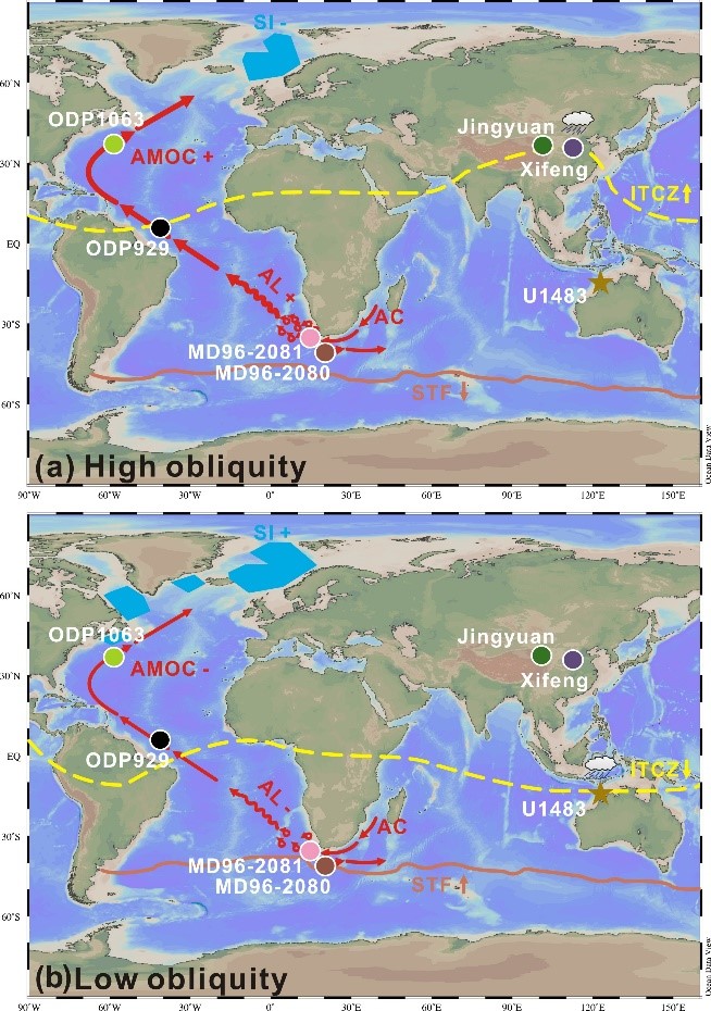 了进一步揭示斜率对热带辐合带的驱动机制,该团队将上述降雨记录与南半球副热带锋线(Subtropical Front, STF)纬向迁移、非洲南部厄加勒斯流(Agulhas Current)泄露量、以及大西洋经向翻转流(Atlantic Meridional Overturning Circulation, AMOC)强度等记录进行了对比,结合已有的模型研究结果,发现斜率高(低)值时,南半球副热带锋线的极向(纬向)迁移,会造成厄加勒斯流泄露量增大(减少),从而使得大西洋经向翻转流增强(减弱),并诱发北大西洋海冰覆盖减少(增加),进而导致热带辐合带向北(南)迁移(图2)。该机制的提出为深入认识高低纬海气联动提供了新范例。