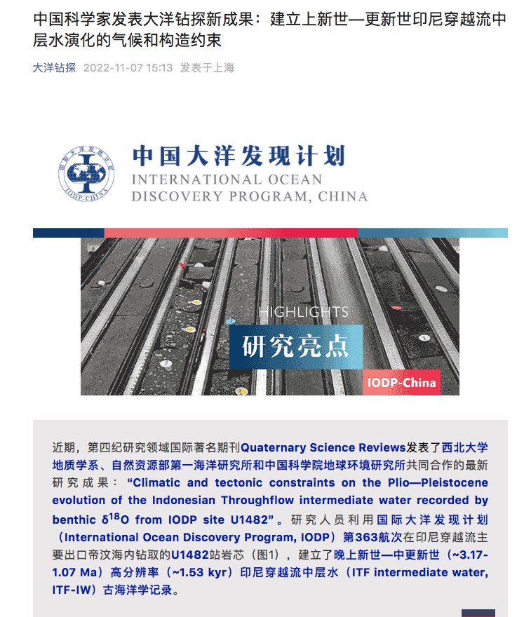 此外,该团队前不久还在第四纪研究领域国际著名期刊《Quaternary Science Reviews》上发表了他们关于北半球冰量扩大期印尼穿越流中层水演化的最新研究成果(https://doi.org/10.1016/j.quascirev.2022.107666),"中国大洋发现计划”予以了报道(https://mp.weixin.qq.com/s/BESvDCGz3llIxz3m0bxvnw)。