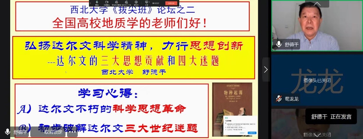 3月27日,地质学拔尖学生培养模式研究虚拟教研室邀请西北大学地质学系舒德干院士做“弘扬达尔文科学精神,力行思想创新”的第二期教学研讨会线上报告。舒德干院士从达尔文成长经历和生物进化论引入,通过自身对早期生命演化探索的亲身经历,循序渐进、由浅入深。深刻的诠释了酷爱大自然,善于观察,勇于实践,精于思考,将科学探索作为自己的终身追求,理性指引,实证求真,勇于创新,自学贯通。将“人文精神,哲学思想”与自然探索相融合,舒院士在分享探索“达尔文的奥秘”旅程中展现出相当的发现能力和广博的知识、扎实的数学功底与实验技能等一系列重要的科学家素质。赖绍聪副校长在总结中提到对于拔尖人才培养而言最为核心的要素不仅是知识的积累和能力的提升,更重要的是崇尚科学精神,追求真理和力行思想创新。通过舒院士的报告,我们能够更加深刻的思考和理解拔尖人才培养的核心和关键。舒院士诠释的深刻道理要融入到拔尖人才的培养体系中,不断的探索和思考,不断的改进完善,为祖国培养栋梁之才。