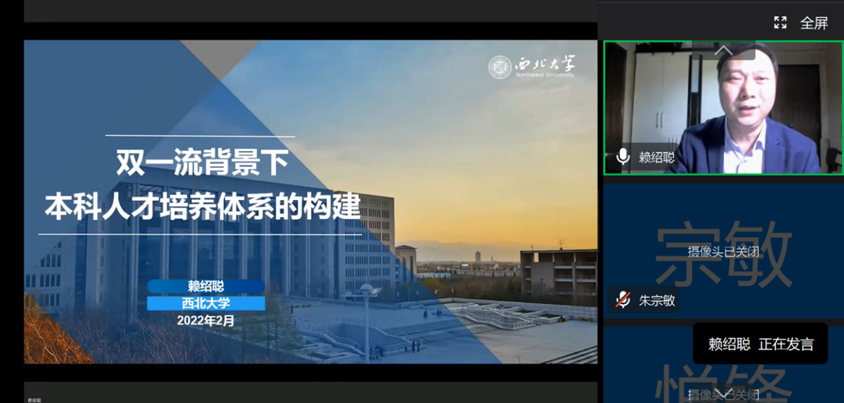 地质学拔尖学生培养模式研究虚拟教研室依托西北大学地质学拔尖学生培养计划2.0基地,联合我国拥有地质学本科专业的北京大学、南京大学、中国地质大学(北京)、中国地质大学(武汉)、吉林大学、中山大学、中国科学技术大学、中南大学、兰州大学、中国海洋大学、合肥工业大学、长安大学、中国矿业大学、成都理工大学、东华理工大学、河北地质大学、长江大学等17所主要高校,形成教学研究共同体,共建共享。西北大学副校长、国家级教学名师赖绍聪教授于3月13日做了题为“‘双一流’背景下本科人才培养体系的构建”的首场报告,分享了当前高等教育总体形势和如何构建一流人才培养体系。