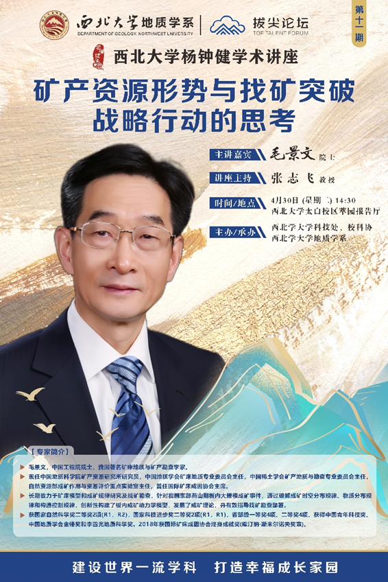4月30日,由地质学系主办的“拔尖论坛”第十一讲暨“西北大学杨钟健学术讲座”系列活动在西北大学太白校区萃园报告厅举行。中国工程院院士毛景文院士应邀为师生作了题为“矿产资源形势与找矿突破战略行动的思考” 的报告。校党委委员、常委、书记蒋林教授代表学校致辞,地质学系系主任张志飞教授主持,学校相关部门负责人和地质学系师生代表听取了报告。