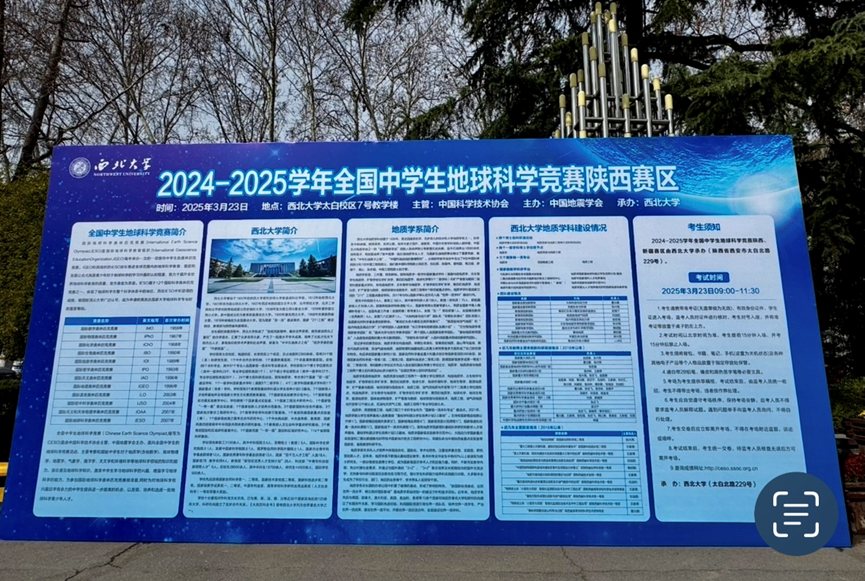 2025年3月23日,由中国地震学会、中国地球物理学会、中国岩石力学与工程学会、中国灾害防御协会主办,西北大学地质学系承办的2024-2025学年全国中学生地球科学奥林匹克竞赛陕西省预赛顺利举行。此次竞赛全省共计2213名中学生参赛,设有西北大学太白校区、汉中龙岗学校、宝鸡中学、商洛丹凤中学4个考点,西北工业大学附属中学、铁一中、高新一中等39所学校学生参赛。