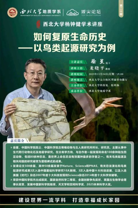 11月24日,由地质学系主办的“拔尖论坛”第二十讲暨“西北大学杨钟健学术讲座”系列活动在西北大学太白校区萃园报告厅举行。中国科学院院士徐星研究员,应邀为437bwin必赢国际官网师生作了题为“如何复原生命历史-以鸟类起源研究为例”的报告。学校相关部门负责人和师生代表听取了报告。
