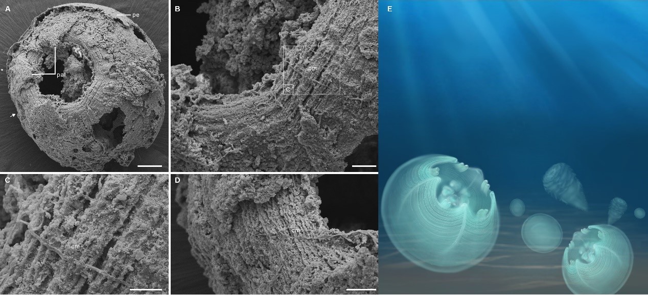 2016年韩健研究员在5.18亿年前的寒武纪澄江生物群中发现了能感受重力变化的、已知最为古老的游泳型的水母。而这种游泳方式所依赖的肌肉,目前为止都没有很好的化石证据。研究团队在更早的5.35亿年前的陕南宁强寒武纪宽川铺组中的底栖型水母胚胎化石中,找到围绕伞缘离散分布的直径9-15微米肌肉束。单个肌肉纤维直径2 微米(Fig.1A-D)。这些肌肉束,跟现代水母一致,都是位于内伞的位置。但是有别于现代水母,这些水母化石,无论是在孵化前还是孵化后很长一段时间,都被包裹在自身分泌的具有保护作用的围鞘之中。因此一般认为这些化石营底栖生活,无自由游泳的能力(Fig. 1E)。研究人员认为这些冠状肌的功能主要是为了取食以及呼吸。因为已经具有了成束的冠状肌,其收缩可以使得下伞腔体积变小,挤压水流喷到围鞘之外;收缩的体形然后通过中胶层的弹性恢复原状,在此过程中外界水流流入围鞘之内,带来小的食物颗粒和氧气。因此推测冠状肌最原始的功能,是与底栖型水母取食、呼吸有关,游泳的功能是后期逐渐摆脱围鞘而演化出来的。