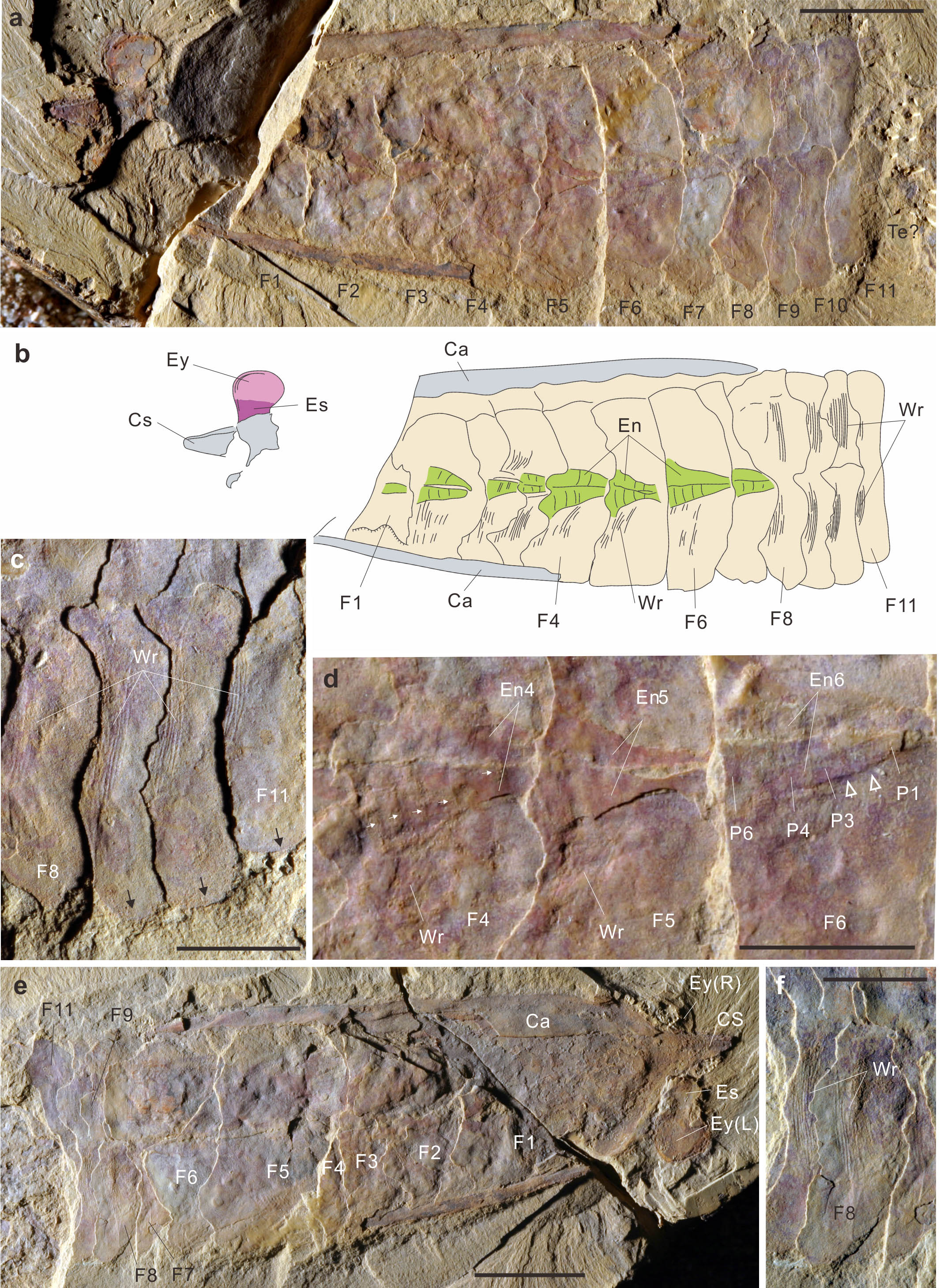 此外,化石证据还表明,三叶型节肢动物的梳状外肢,其实与身体直接相连,且鳃片状结构具有与现代节肢动物上肢(外叶的一部分)类似的呼吸功能。因此,寒武纪时期节肢动物所谓的外肢,其实是具有呼吸功能的外叶结构。那么,真正的外肢去了哪里?这又是一个谜团。也许在寒武纪时期,节肢动物发育过程中外肢并未表达,又或许外肢存在于附肢的某一部分中,这些都尚待更多的古生物学证据来进一步完善。