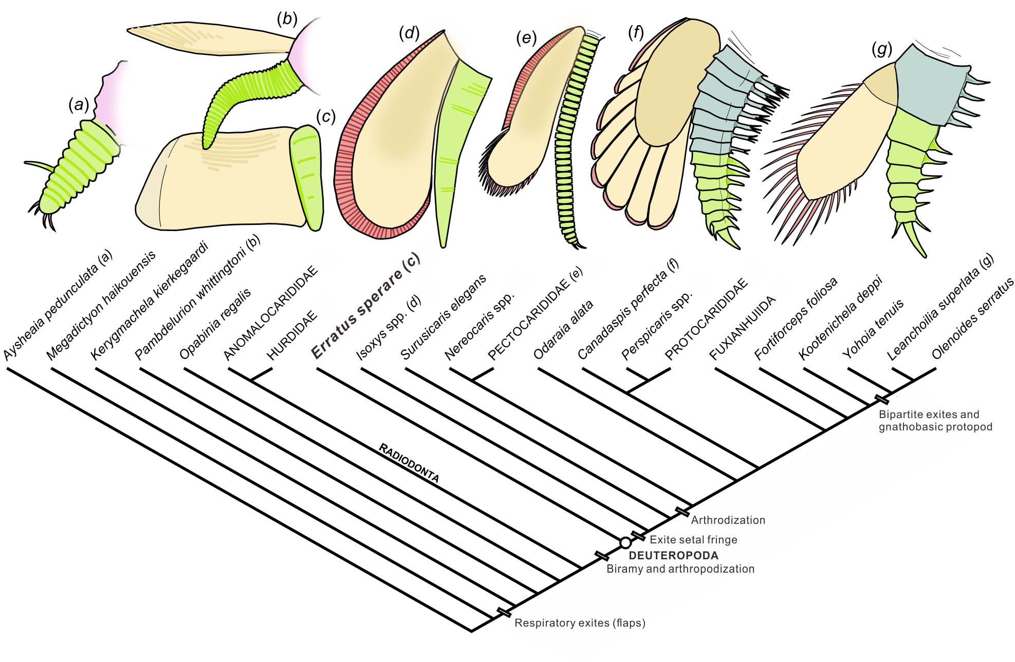 节肢动物是地球上的超级生物类群,占已知动物总数的85%,这种极高的分异度很大程度上与附肢的形态多样性有关。节肢动物附肢的原始形态被认为是双肢型的,即“游泳腿外肢(exopod+行走腿内肢(endopod)”,两者通过原肢节(protopod)与身体连接。在寒武纪时期,很多节肢动物类群都具有这种双分叉的附肢结构,这种分叉结构与双肢型附肢的演化关系及同源性问题一直是节肢动物演化研究的焦点。近年来,寒武纪海洋中的顶级捕食动物奇虾类,被认为是最原始的真节肢动物。然而,它们身体两侧延伸出的巨大片状附肢(flaps),使得双肢型附肢在各类群间的形态对比以及起源演化研究更加困难。