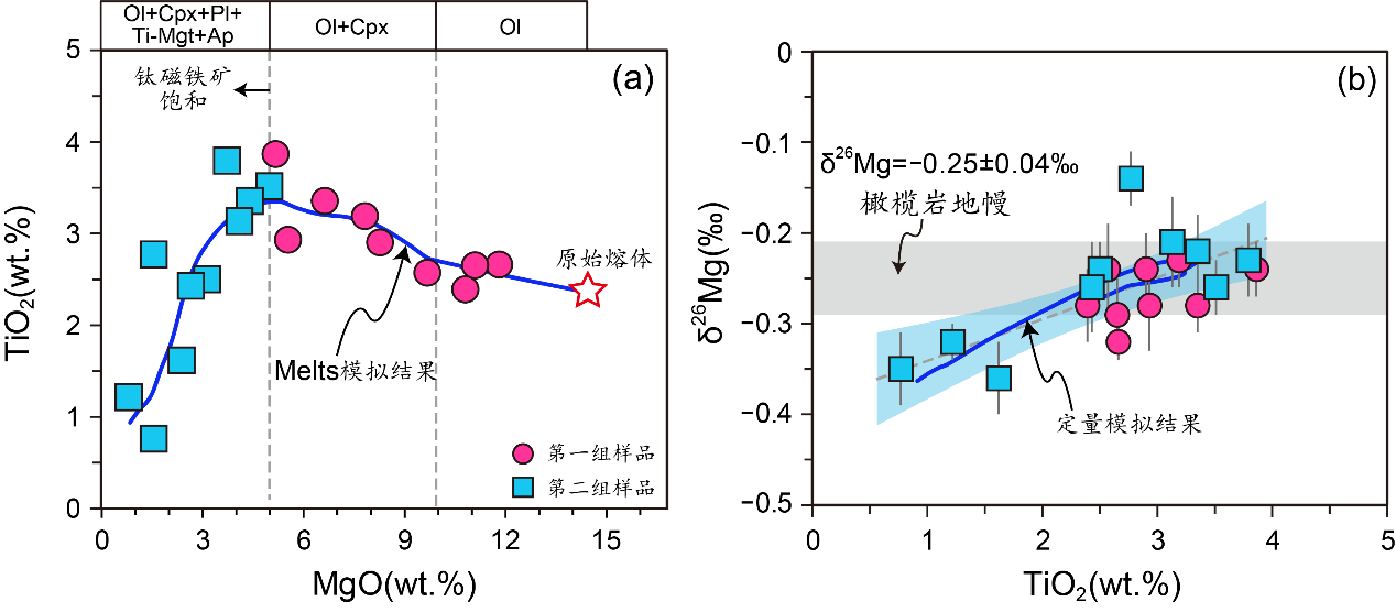 为更好地制约镁同位素在玄武质岩浆演化过程中的分馏行为,团队对来自南大西洋St. Helena岛的同源碱性玄武质岩石进行了精细的镁同位素研究。这组岩石具有连续且宽泛的成分变化。岩性从苦橄玄武岩和碧玄岩连续演化到玄武质粗面安山岩和粗面安山岩。化学组成上MgOSiO2的含量变化分别为15.72 ~ 0.81 wt.%43.52 ~ 54.53 wt.%。一个显著的特征是,当MgO含量约为5 wt.%时,多数主微量元素与MgO之间的相关关系表现出明显转折,指示分离结晶的矿物组合发生了明显改变。当MgO > 5 wt.%时,分离的矿物主要为橄榄石和单斜辉石,而当MgO < 5 wt.%时,分离的矿物主要为斜长石和钛磁铁矿以及少量橄榄石、辉石和磷灰石(图1a)。镁同位素分析结果表明:MgO > 5 wt.%的样品镁同位素组成变化较小(δ26Mg = 0.32‰ ~ 0.23‰),而MgO < 5 wt.%的样品镁同位素组成变化较大(δ26Mg = 0.36‰ ~ 0.14‰)且与TiO2Na2O+K2O的含量以及Ti/Ti*比值(该比值指示Ti的亏损或富集程度)等呈现出协变关系(图1b)。