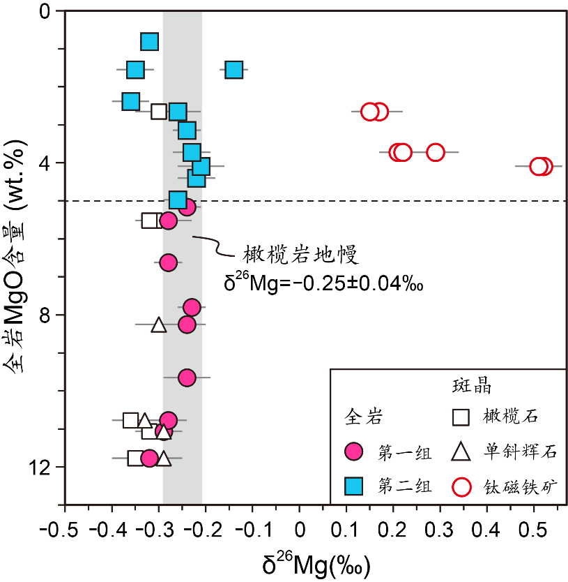 对这些样品的斑晶开展的镁同位素分析发现,钛磁铁矿具有比橄榄石、单斜辉石和对应的全岩明显偏重的镁同位素组成(图2)。在玄武质岩浆结晶分异晚期,当这种氧化物大量从岩浆中分离之后,残余熔体的镁同位素组成会明显变轻(图1b)。
