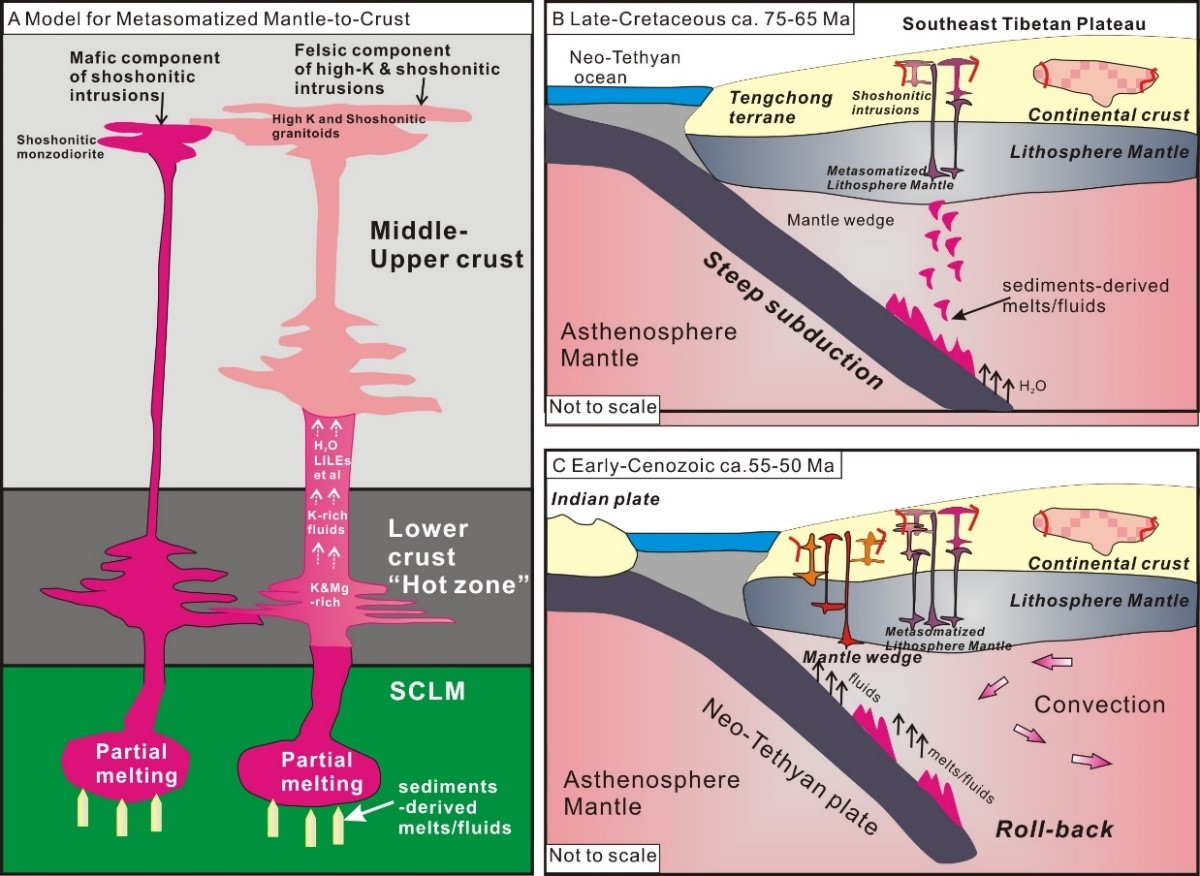 在地球上分布广泛却通常以小规模岩珠而存在的高钾钙碱性-钾玄质岩石为揭示壳幔相互作用提供关键岩浆信息,通常产生于碰撞后拉张伸展背景下。目前很少有研究工作注意到活动大陆边缘弧背景下产生的多阶段大规模高钾钙碱性-钾玄质岩石组合。此次研究发现,在青藏高原东南缘存在着一个体积约28000 km3的晚白垩世-早新生代巨量高钾钙碱性-钾玄质岩体。其中,镁铁质侵入体属于钾玄质系列,含有高的钾镁 (K2O, ~ 3.3wt.%; Mg, ~ 5.1 wt.%; Mg#, ~ 57),轻稀土(LREE)和大离子亲石元素(LILE)含量,低的Ba/Th, Ba/La, Sm/La (< 0.3), Nb/Yb208Pb/206Pb比值,高的Hf/Sm (> 0.70), Th/Yb, Th/La (> 0.2) and La/Sm比值,不具有明显Eu异常。镁铁质矿物以含水的镁闪石和富钾镁的黑云母组成,这些特征指示了岩石圈地幔源区, 其受到来源于循环沉积物来源流体/熔体的交代作用。共生的长英质侵入体显示出高硅、高度富集碱性元素及不相容元素特征,镁铁质矿物也以铁闪石和铁云母为主,这些特征明显指示了富集大陆源区,然而源区受到同期富钾镁铁质岩浆释放出流体的活化作用。因此我们认为:相对于碰撞后和早期裂谷环境下生成的小规模钾质岩浆,这些大规模多期次的高钾钙碱性-钾玄质岩浆作用产生于活动大陆边缘弧背景下从地幔到上部地壳的穿地壳岩浆系统(图1)。结合地球物理学的数据观察,高钾钙碱性-钾玄质岩浆作用系统的产生与洋壳板片俯冲作用的时空演化密切相关(图1),既从新特提斯洋俯冲到印度-亚洲初始碰撞过程中,洋壳板片从低角度俯冲转向高角度俯冲,以及与随后发生的板片回撤和断裂作用高度耦合。