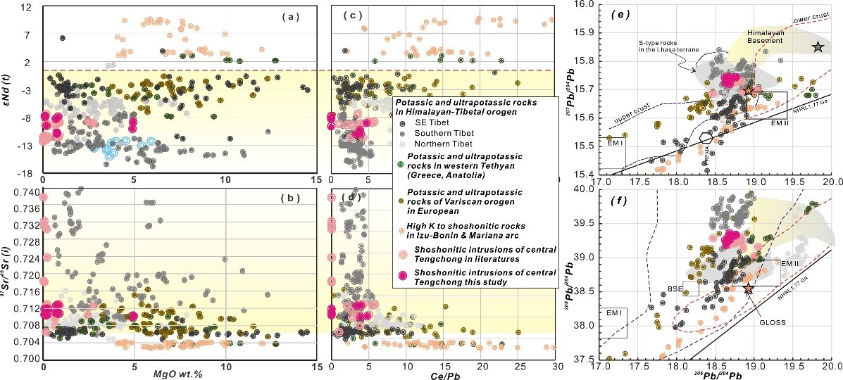 同时,本次研究还发现:无论是碰撞后构造背景下还是大陆边缘弧背景下的高钾-钾玄质岩浆作用都具有比弧裂谷环境下更高的Th/Yb, Th/La, 206Pb/204Pb, 207Pb/204Pb, 208Pb/204Pb, 87Sr/86Sr比值和更低的Ce/Pb, εNd(t) and εHf(t)值(图2)。