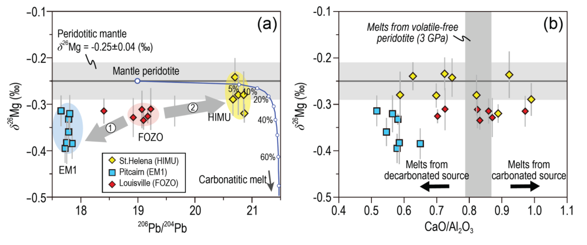 ·   来自南太平洋Pitcairn岛的EM1型洋岛玄武岩(在洋岛玄武岩中具有最低的206Pb/204Pb比值)虽然具有低的δ26Mg值(图1a),但其元素组成CaO/Al2O3比偏低,与预期的含碳酸盐地幔熔融产生的熔体成分不吻合(图1b)。这一Mg同位素和主量元素解耦的现象可能归因于早期板块俯冲过程中的脱碳反应,导致再循环的硅酸盐物质继承了碳酸盐的低δ26Mg特征。