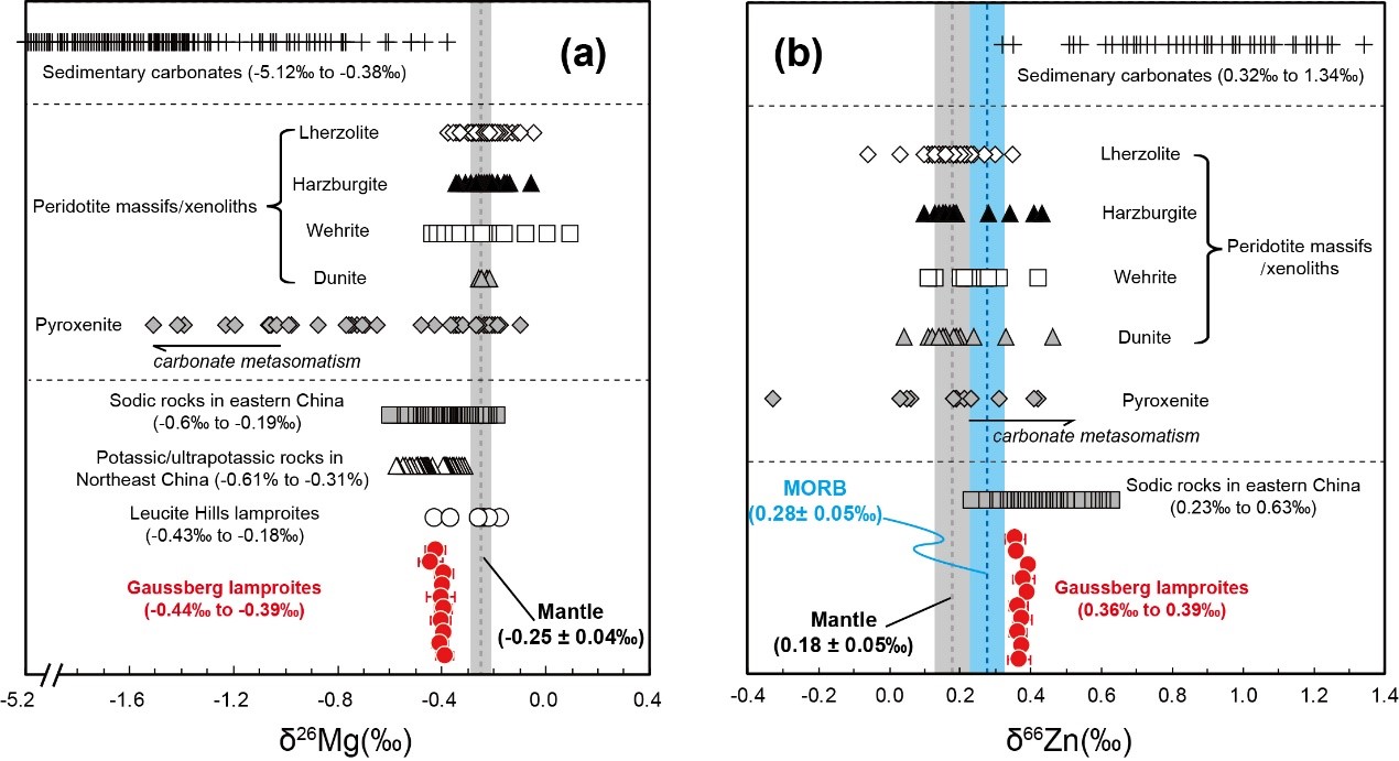 为了阐明克拉通型钾镁煌斑岩与再循环碳酸盐之间的成因联系,437bwin必赢国际官网“岩石学与地幔地球化学学科团队”刘建强博士及其合作者对采自南极洲的Gaussberg钾镁煌斑岩进行了Mg和Zn同位素的联合研究。结果表明这些钾镁煌斑岩具有比地幔更轻的d26Mg(–0.44‰至–0.39‰)和更重的d66Zn(0.36‰至0.39