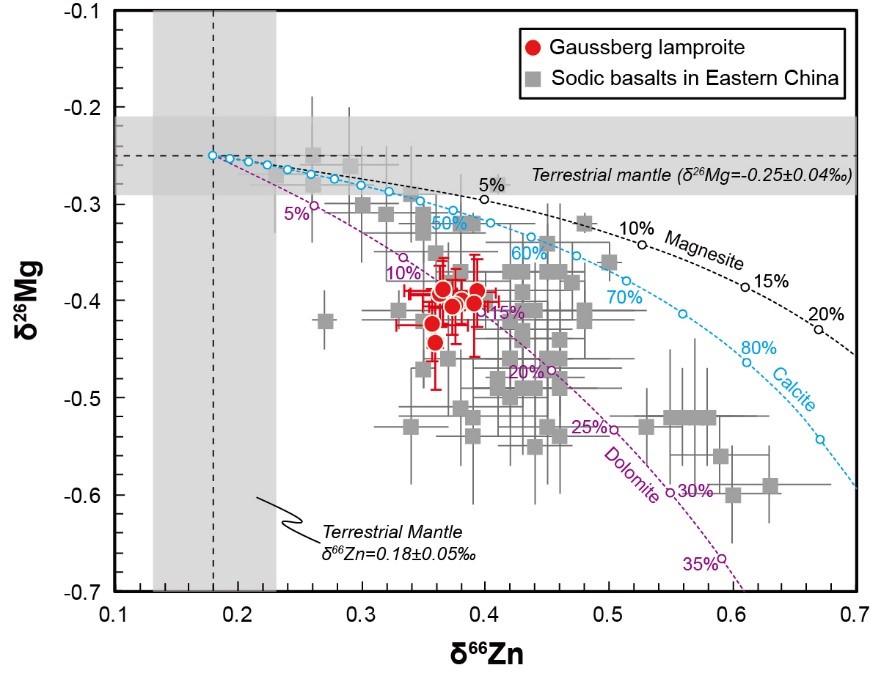 进一步的研究表明岩浆期后的蚀变作用、地壳混染以及分离结晶和部分熔融作用都不能解释这些Mg和Zn同位素的异常特征。相反,如果源区有沉积碳酸盐物质(通常具有轻的d26Mg和重的d66Zn)的参与则可以很好地吻合钾镁煌斑岩的Mg和Zn同位素异常。定量模拟计算表明Gaussberg钾镁煌斑岩的源区需要加入10-15%的白云石类碳酸盐(图2)