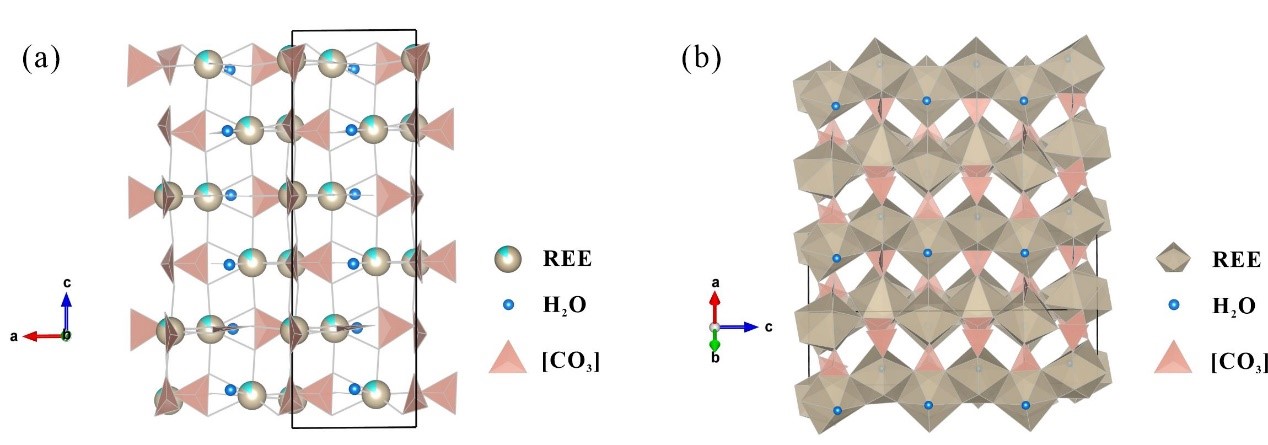 毓川碳钇矿是一种罕见的含水碳酸盐重稀土矿物,在显微镜下,毓川碳钇矿呈透明、亮灰色,多以30-300um的板状或脉状晶体,与磷钇矿、氟碳钇矿、斑铜矿、黄铜矿、闪锌矿、方铅矿、硬石膏等共生(图1)。毓川碳钇矿是由Y-O配位多面体和[CO3]平面三角形构成的(图2),其经验化学式为(Y1.61Yb0.11Er0.11Dy0.08Ho0.03Gd0.02Tm0.02)Σ1.99(CO3)3·H2O,理想化学式为Y2(CO3)3·H2O,属于三斜晶系,空间群为P-1(#2),晶胞参数为:a = 6.2134(3) Å, b = 8.9697(3) Å, c = 19.9045(7) Å, α = 91.062(3)°, β = 90.398(3)°, γ = 91.832(3)°, V = 1108.54(8) Å3, Z = 6。