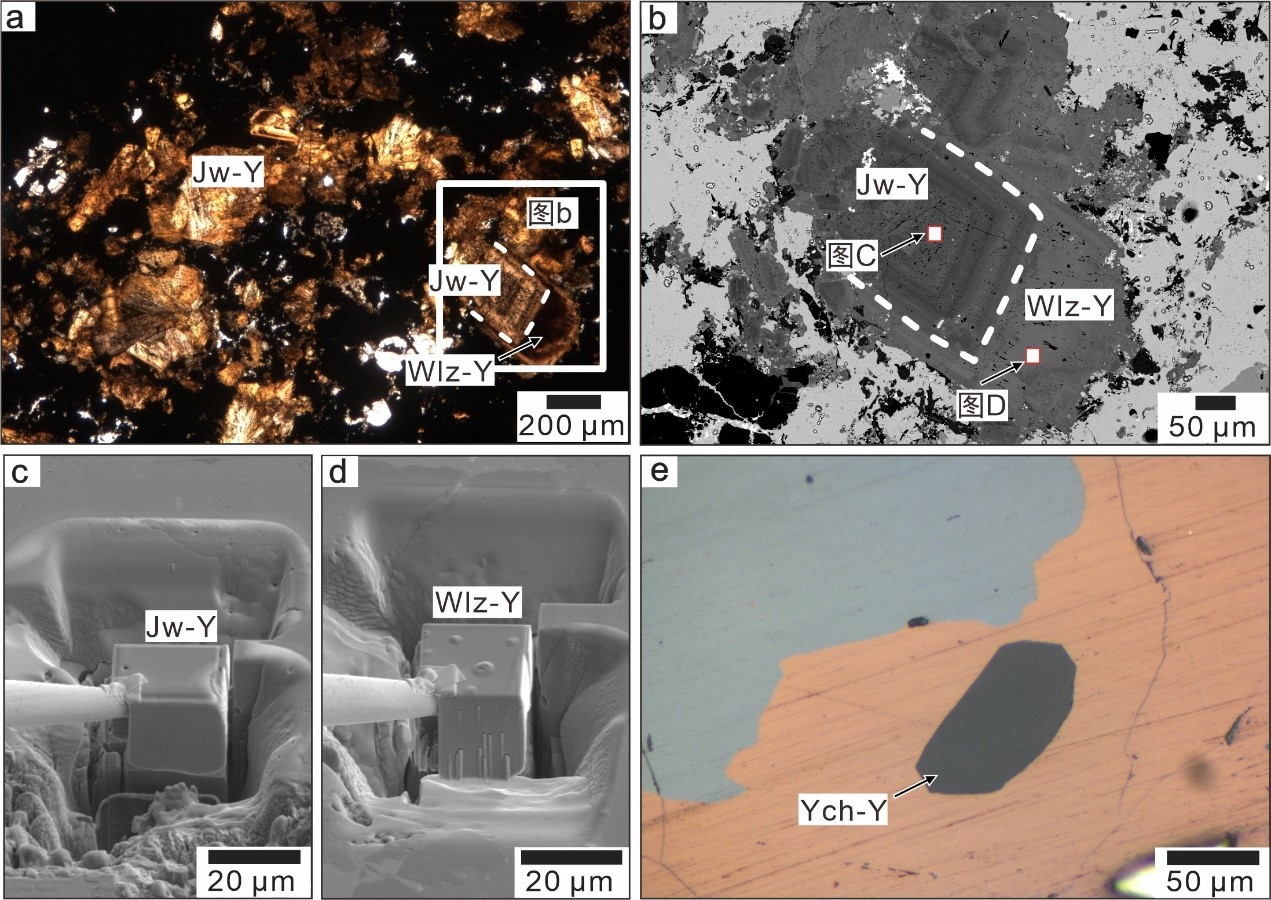图1. A-D.景文矿和文兰钒钇矿的显微镜下照片(A)、背散射照片(B)和FIB取样照片(C-D);E. 毓川碳钇矿显微镜下照片. Ych-Y:毓川碳钇矿;Jw-Y:景文矿;Wlz-Y:文兰钒钇矿