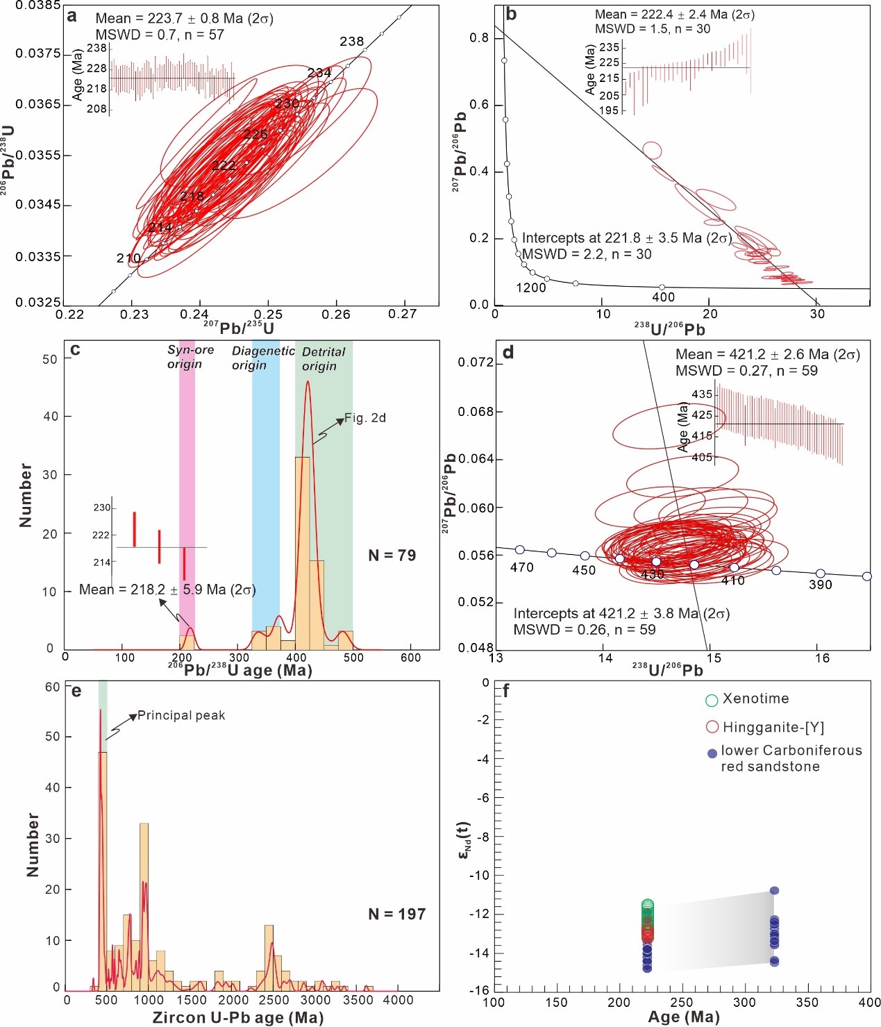 图2 a-b矿石中沥青铀矿和磷钇矿U-Pb年龄;c-d. 砂岩中磷钇矿U-Pb年龄;e. 砂岩中碎屑锆石U-Pb年龄;f. 矿石中磷钇矿、兴安石和忠信组红色砂岩Nd同位素.