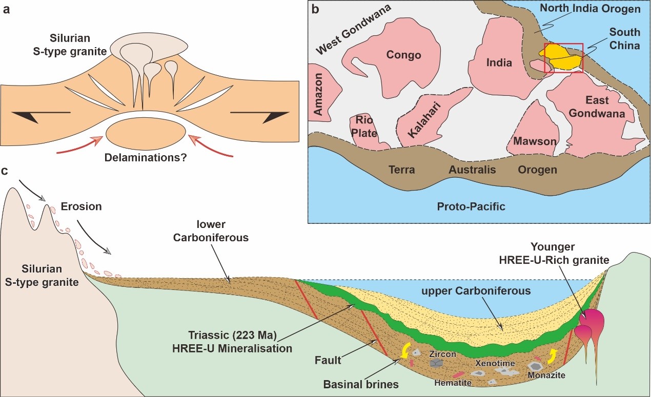 最后,由于华南加里东期S型花岗岩的形成响应于东冈瓦纳大陆最终拼合,而全球范围内,S型花岗岩在这一时期也达到了最高峰。我国华南多个离子吸附型重稀土矿床的成矿母岩侵位于古生代沉积盆地,以及玉水铜矿中富集大量重稀土,表明加里东期形成的S型花岗岩风化后形成的沉积岩,可为后期岩浆或热液中稀土的富集提供来源(图4)。基于此,作者提出冈瓦纳大陆的最终聚合提高了全球地壳孕育稀土和铀等战略性矿产的能力。