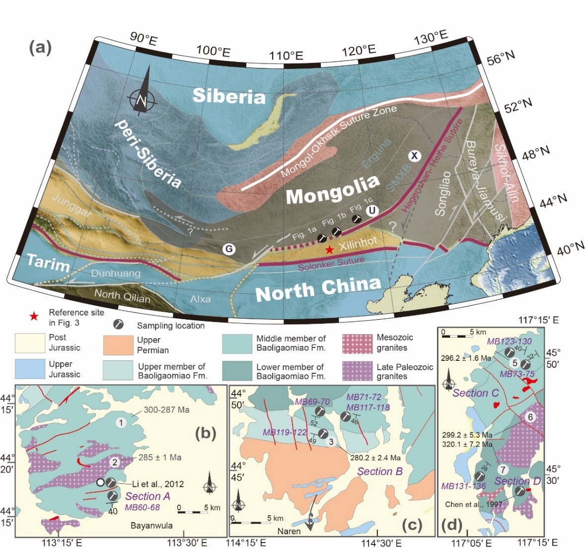 在现有的Pangea超大陆重建方案中,通常不将东亚主要的块体(华北、华南、印支及蒙古)作为晚古生代Pangea的一部分。其中,古亚洲洋分隔了华北-塔里木与蒙古、西伯利亚等板块,其闭合时间争论已久,极大地制约了东亚块体在Pangea超大陆中的古地理重建。现有的关于古亚洲洋闭合的争议时间可大致分为晚泥盆世(380 Ma, Tang et al., 1990; Xu et al., 2013; Zhao et al., 2013; Shao et al., 2014)和晚二叠世(250 Ma, Li et al., 2006; Deng et al., 2009; Eizenhöfer and Zhao, 2018; Xiao et al., 2018; Zhang et al., 2018; Ren et al., 2020)两种观点。其争论的核心就在于380-250 Ma (石炭纪-二叠纪)该地区的古地理重建。古地磁学是用来进行古板块重建最有效的方法,但是以往的研究中没有高质量的古地磁数据来约束古亚洲洋北岸蒙古板块在晚石炭世-早二叠世的古地理位置,使得我们无法有效解决上述争议。