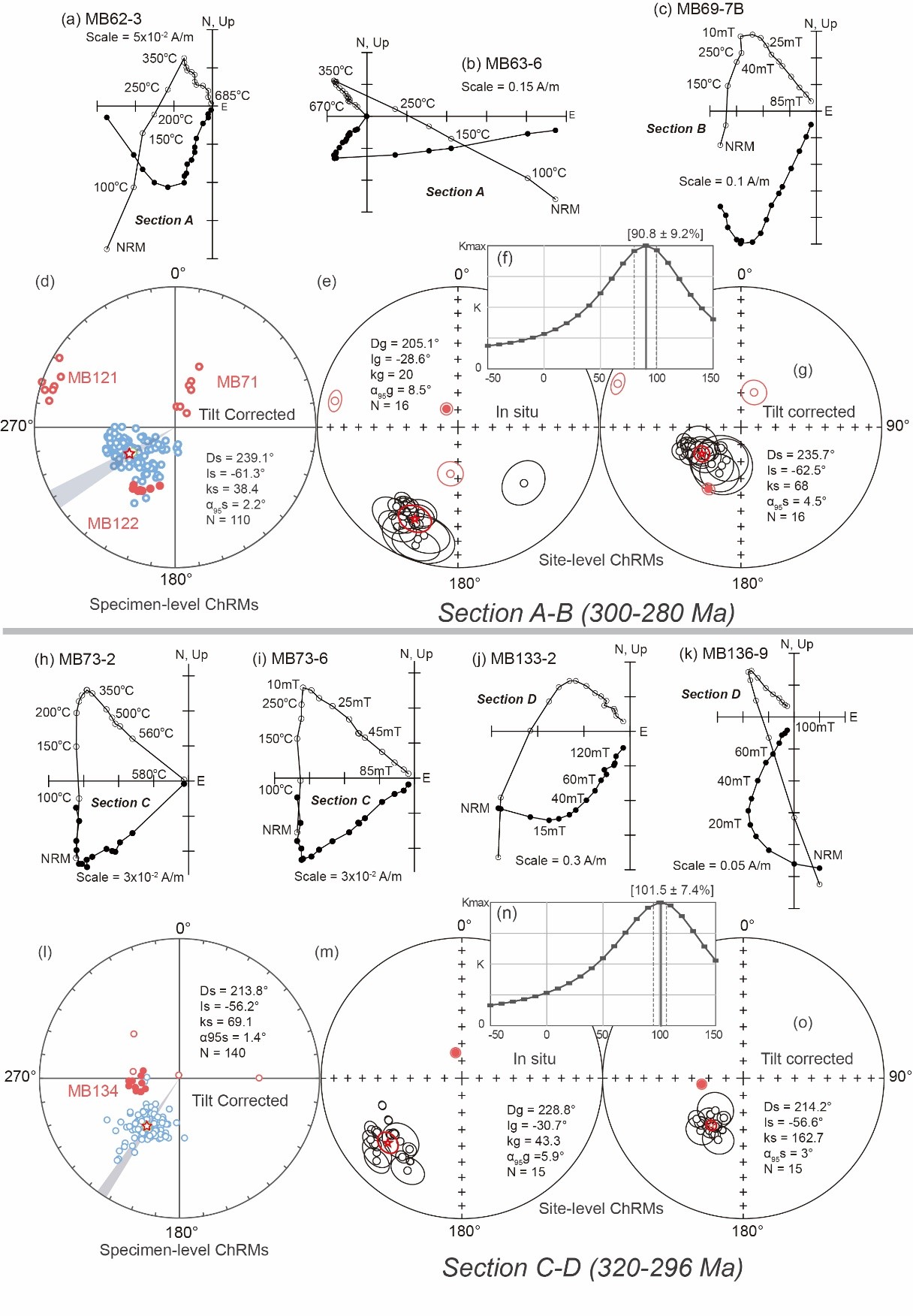 在本次研究中,我们从蒙古板块南缘(南蒙-兴安构造带)320-280 Ma宝力高庙组的一套火山沉积地层中获得了320-296 Ma和300-280 Ma的两个高质量古地磁结果(图1, 2),稳定的特征剩磁分量均通过了褶皱检验和长期变检验,单一负极性显示了与Kiaman负极性超时的一致性,指示岩石很可能记录了可靠的原生剩磁。