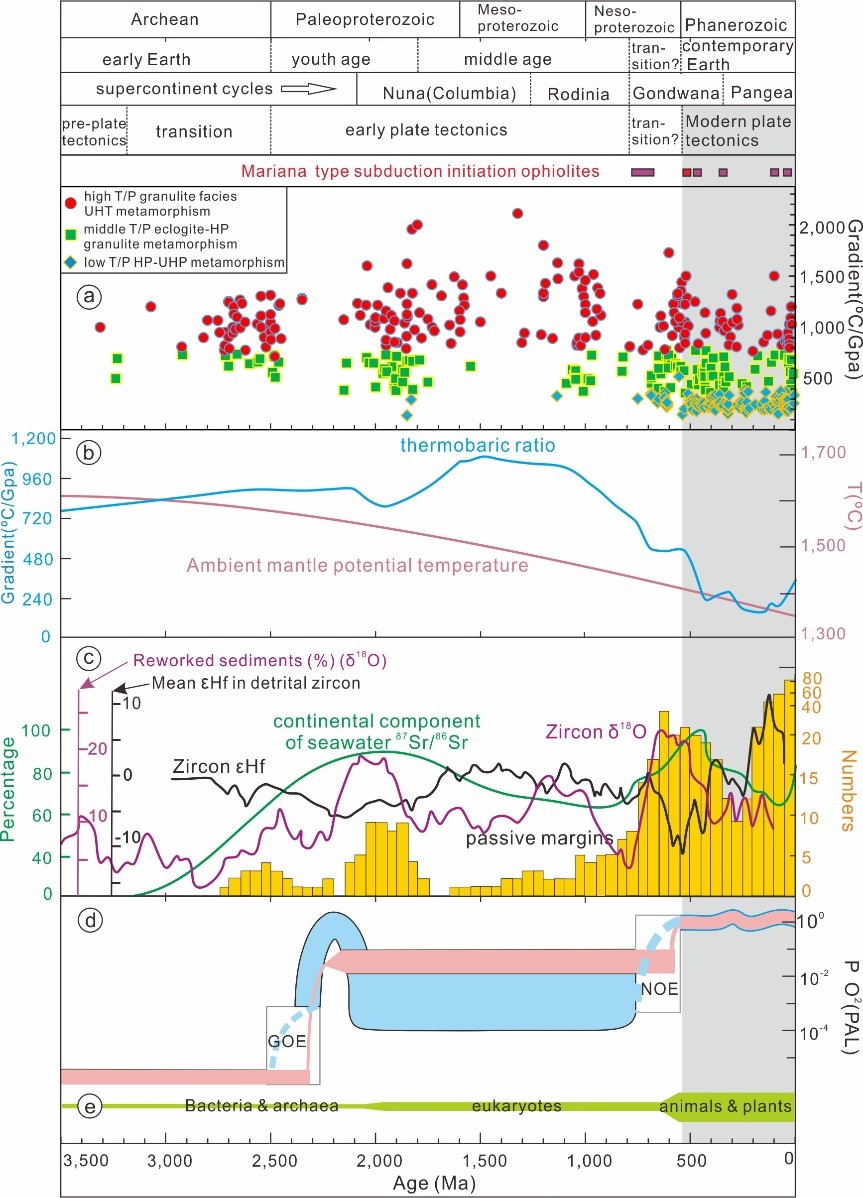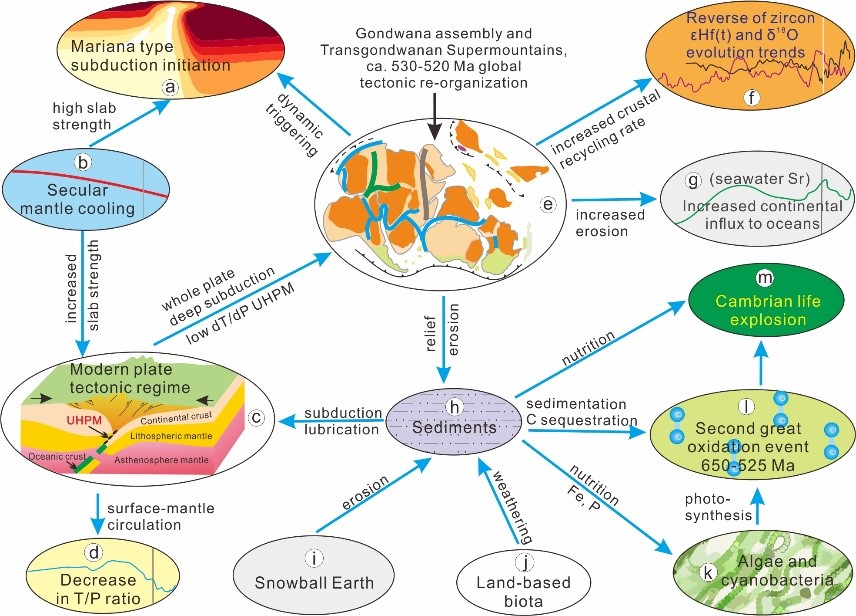 5.3-5.2亿年前的全球构造联动,以及多项同期地质现象与化学指标的变化,如温度压力(T/P)比值、锆石Hf-O同位素演化趋势、被动陆缘数量、低T/P比的超高压变质岩大量出现、海水Sr同位素比值等,表明5.3-5.2亿年前必然是地球演化历史上的一个重要里程碑,但必然有一种一级地球动力学过程从根本上推动了这些。研究人员发现这些地质现象与化学指标均指示俯冲活动的显著增强。综合多个地质与化学指标以及板块构造的特征与识别标志,团队首次提出在冈瓦纳大陆聚合阶段、5.3-5.2亿年前现代板块构造建立这一观点,对国际上提出的新元古代现代板块构造启动这一认识进行了进一步的推动与扩展。现代板块构造的建立和全板块的深俯冲极大促进了地球深部与表层物质与能量的交换效率,造成地球降温,并显著促进了地壳物质的再循环,是促进晚新元古代-寒武纪期间表生圈层剧变、促进现代地球建立的一级驱动力。