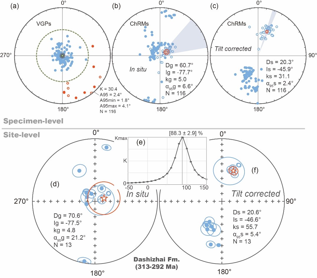 目前,嫩江洋西北岸的蒙古板块已积累了石炭纪-二叠纪的古地磁数据,而东南岸的松辽-佳木斯板块却无古地磁数据约束其古地理位置。沿嫩江缝合带两侧,出露有志留纪-石炭纪的俯冲相关岩浆岩,记录了嫩江洋的双向俯冲过程(Feng et al., 2015; Liu et al., 2019; Ma et al., 2020);在嫩江缝合带东南侧,乌兰浩特地区出露有一套较为完整的上石炭统-上二叠统火山沉积序列。近日,西北大学地质学系超大陆学科团队张东海博士、赵国春院士联合北京大学黄宝春教授及其他国内外合作者针对这套地层开展了系统的古地磁学与年代学研究(图1b),并在大石寨组火山沉积地层中获得了松辽地块首个石炭纪-二叠纪古地磁数据(图2, 3)。本研究表明在大约300 Ma左右,古亚洲洋北岸的东北亚微陆块群已汇聚成为统一的Amuria复合陆块,位于~34°N的古纬度;位于中纬度的Amuria陆块与南侧赤道低纬度的华北板块、锡林浩特地块以古亚洲洋相隔,阻碍了两侧陆块的生物混生,直至250 Ma完成拼合,形成统一的Cinamuria板块(图4)。这一研究成果已在线发表于国际地学权威期刊《Journal of Geophysical Research: Solid Earth》(Nature Index源期刊),西北大学地质学系和大陆动力学国家重点实验室为第一单位和通讯单位。