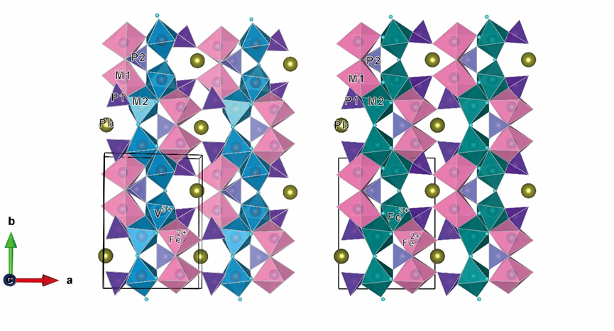 褐磷钒铁铅石和绿磷铁铅石均属于绿磷铝钡石族(bjarebyite group)。绿磷铝钡石族的化学成分通式是XM12M22[PO4]3(OH)3。此次发现的两种磷酸盐新矿物X组阳离子为Pb,M1组为Fe2+,M2组分别为Fe3+和V3+。褐磷钒铁铅石的理想分子式为PbFe2+2V3+2[PO4]3(OH)3,其呈半透明,为褐色或绿褐色,呈他形粒状、板状、粒径约5-100um,常包裹黑钒铁矿,分布在黄铜矿中,与方铅矿、闪锌矿、硬石膏等伴生。绿磷铁铅石理想分子式为PbFe2+2Fe3+2[PO4]3(OH)3,其呈深绿色,未见包裹黑钒铁矿。这两种磷酸盐新矿物的晶体结构特征与绿磷铝钡石族其他矿物相似,均为单斜晶系,空间群为:P21/m(#11)。V-O八面体或Fe3+-O八面体共棱成对,再共角顶连结成平行b轴的链。Fe2+-O八面体亦共棱成对,八面体对与八面体链共棱连结。P1-O四面体连接八面体链,P2-O四面体连结两种八面体对,Pb2+位于结构的大孔隙中。