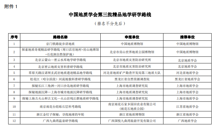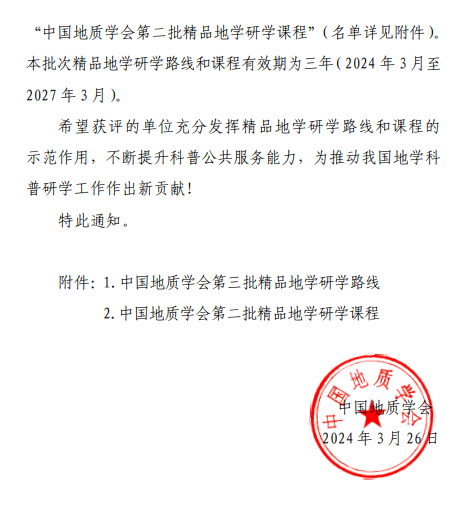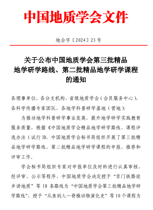 日前,中国地质学会公布了第三批精品地学研学路线、第二批精品地学研学课程入选结果,437bwin必赢国际官网获批中国地质学会第三批精品地学研学路线。