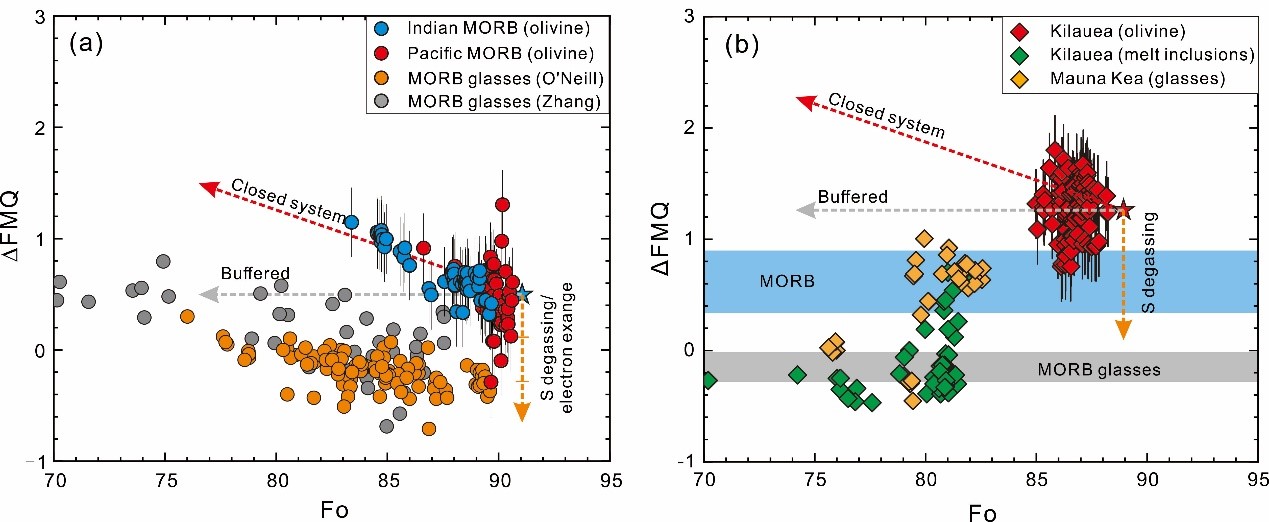 通过将KDOl/melt V/Sc氧逸度计应用于东太平洋洋隆和西南印度洋MORB样品,发现橄榄石中记录的氧逸度为FMQ+ 0.69 ± 0.22,显著高于MORB玻璃中Fe元素记录的氧逸度(图2)。在排除分离结晶作用和脱气作用的影响之后,本文提出淬冷过程中不同变价元素之间的电子交换反应是造成橄榄石和玻璃中记录的氧逸度存在分歧的原因,橄榄石中记录的高氧逸度可能反映了MORB初始熔体的氧逸度。