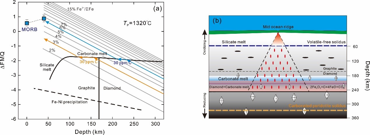 上述研究表明软流圈地幔的氧逸度可能显著高于岩石圈地幔,这对我们理解深部碳循环过程以及碳酸盐熔体的形成机制均有重要的指示意义。