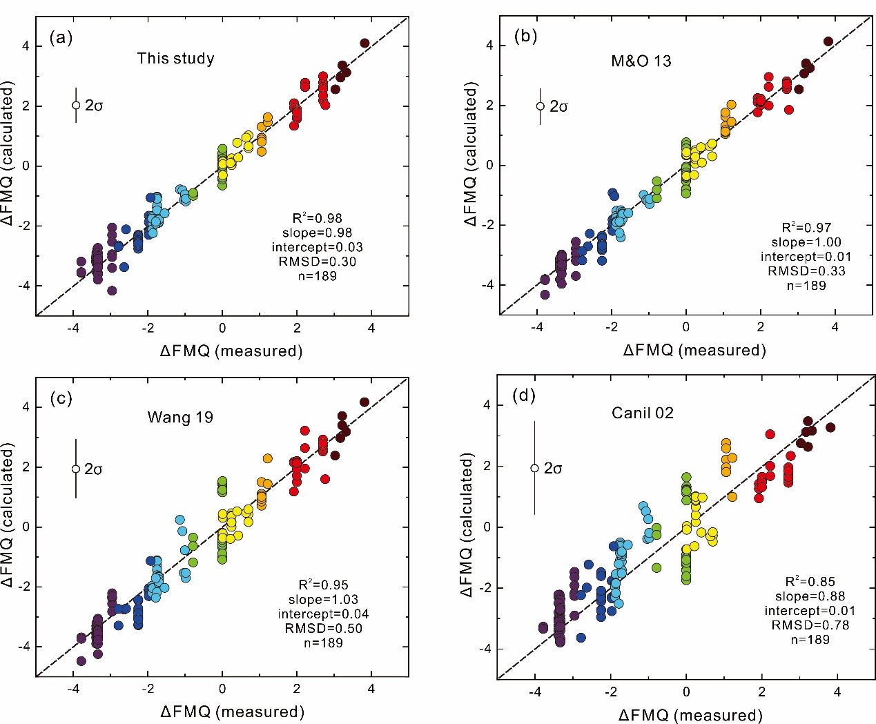 图1 不同氧逸度计精度对比(a) KDOl/melt V/Sc氧逸度计 , (b) Mallmann and O'Neill. (2013), (c) Wang et al. (2019) and, (d) Canil (2002).
