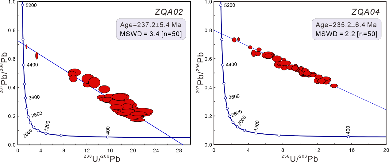 图1 座倾错组原位方解石U-Pb测年Tera-Wasserburg图解