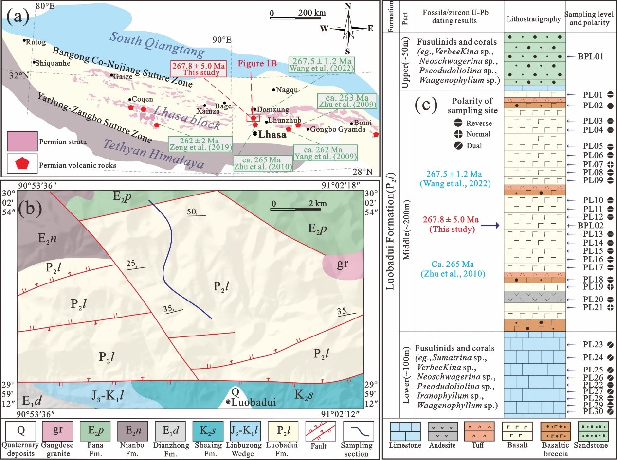 拉萨地块位于青藏高原南部,夹持于雅鲁藏布江缝合带和班公湖-怒江缝合带之间,这两条缝合带被认为是新特提斯洋向东延伸的地质遗迹。新特提斯洋在古生代晚期至中生代早期将冈瓦纳大陆与劳亚大陆分隔开。因此,厘定拉萨地块在二叠纪时期的古地理位置和运动史对揭示雅鲁藏布江洋、班公湖-怒江洋与新特提斯洋的时空演化关系具有关键意义。然而,受限于晚古生代古地磁数据的匮乏,拉萨地块从冈瓦纳裂解的具体时间和机制仍存争议,新特提斯洋早期构造演化模式也尚未形成统一认识。