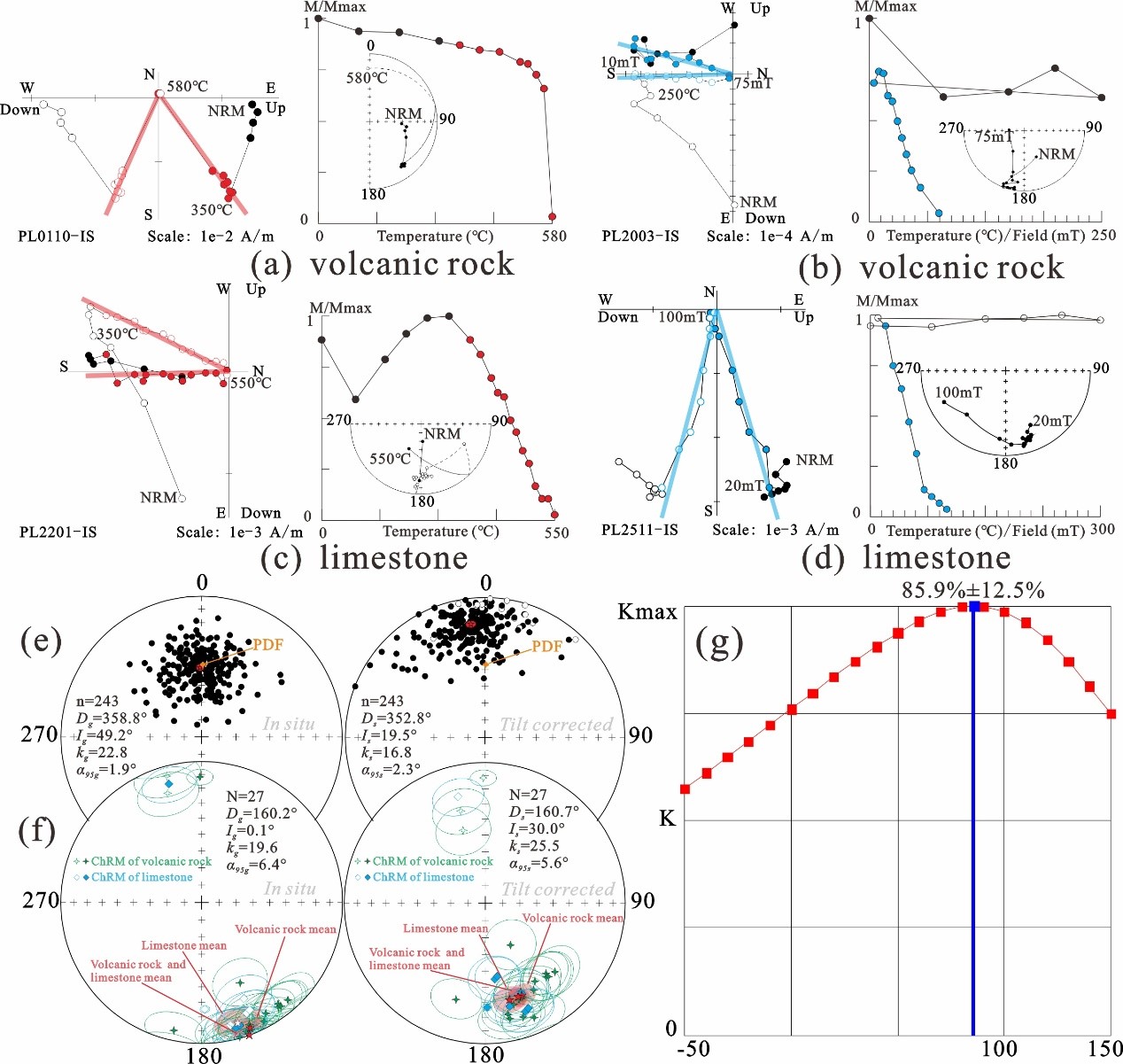 3. a, b)火山岩样品的退磁结果;(c, d)灰岩样品的退磁结果,所有结果均在地理坐标系下;(e)低温/低场分量的等面积投影图(样品水平);(f)特征剩磁分量等面积投影图(采点水平);(g)特征剩磁分量逐步展平结果(文献来源及备注请参阅论文正文)