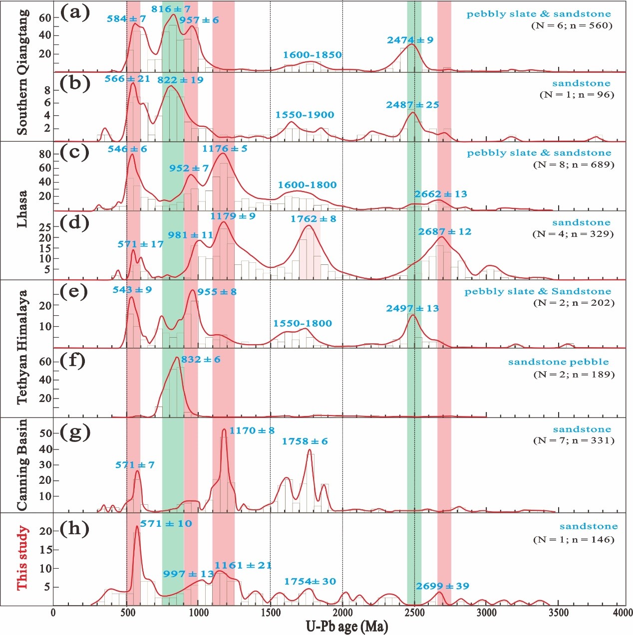 2. 本研究获得的碎屑锆石年龄分布图(h)及西藏和澳大利亚Canning盆地石炭二叠纪地层中的碎屑锆石年龄分布(a–g,文献来源请参阅论文正文)