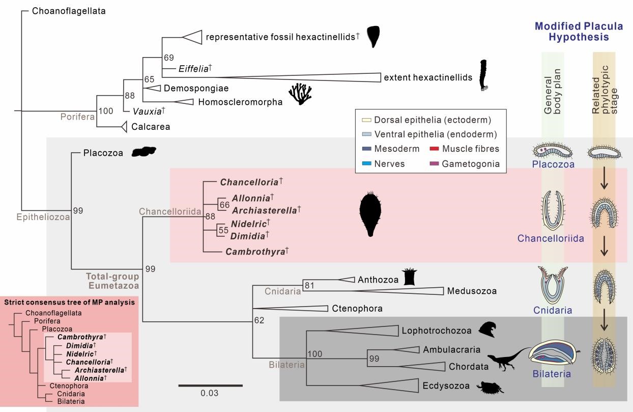 在最新研究中,贠浩等对现有的开腔骨软躯体化石和骨片化石记录进行了详细梳理,将归纳的形态学信息运用到了分支系统学分析之中。在得出的系统发育树中,开腔骨目形成了一个单系分支,整体位于扁盘动物(Placozoa)和所有现生真后生动物(包括栉水母、刺胞动物和两侧对称动物)之间(图2),说明开腔骨动物是表皮动物(Epitheliozoa)的一个已灭绝的分支,属于真后生动物的总群,并且很可能是真后生动物的干群。