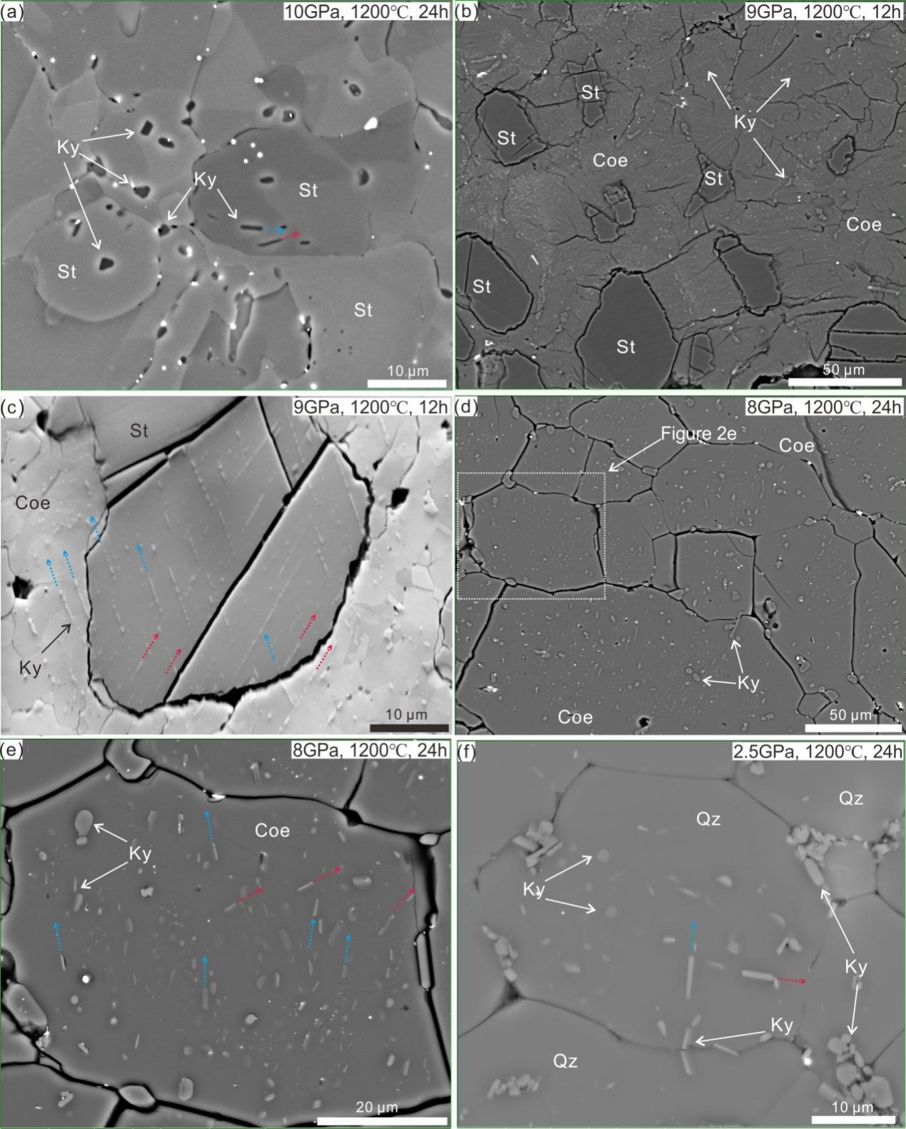 (1)在斯石英稳定域,随着压力与温度降低,实验产物中除斯石英外,在其颗粒内部及边界处出现了棒状或粒状蓝晶石(图2a-b),同时斯石英中铝含量逐步降低,表明这些蓝晶石都是母体含铝斯石英的出溶产物;当压力降至柯石英和石英稳定域时(图2d-f),实验产物中柯石英和石英几乎都不含铝,即二者都不是出溶蓝晶石的母体矿物,说明其颗粒内部及粒间的蓝晶石都是继承自先期斯石英出溶的蓝晶石;