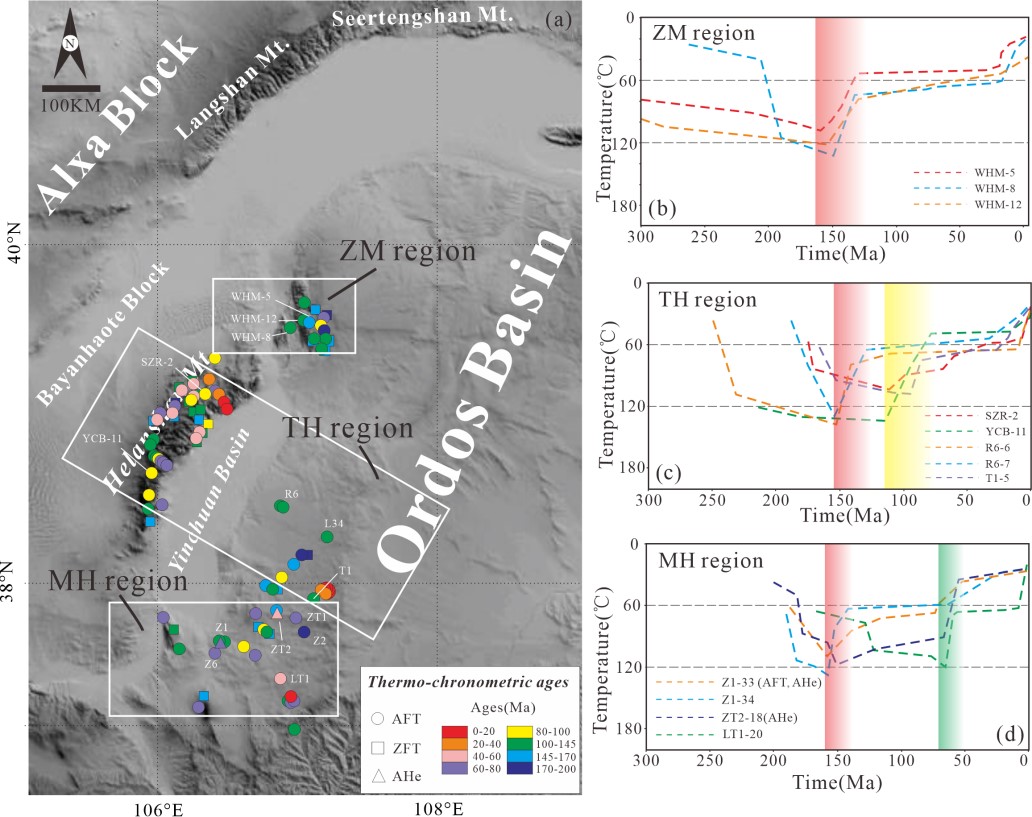 现有热年代学数据主要集中在西缘局部区域(南部及贺兰山地区),空间分布较为分散,缺乏系统性研究。另外盆地边缘与内部的构造差异尚未明确,限制了对整体构造演化的深入理解。针对这些问题,西北大学地质学系任战利教授团队利用多种低温热年代学技术,结合热历史反演模型,精确约束了鄂尔多斯盆地西缘中北部地区的抬升和冷却历史。