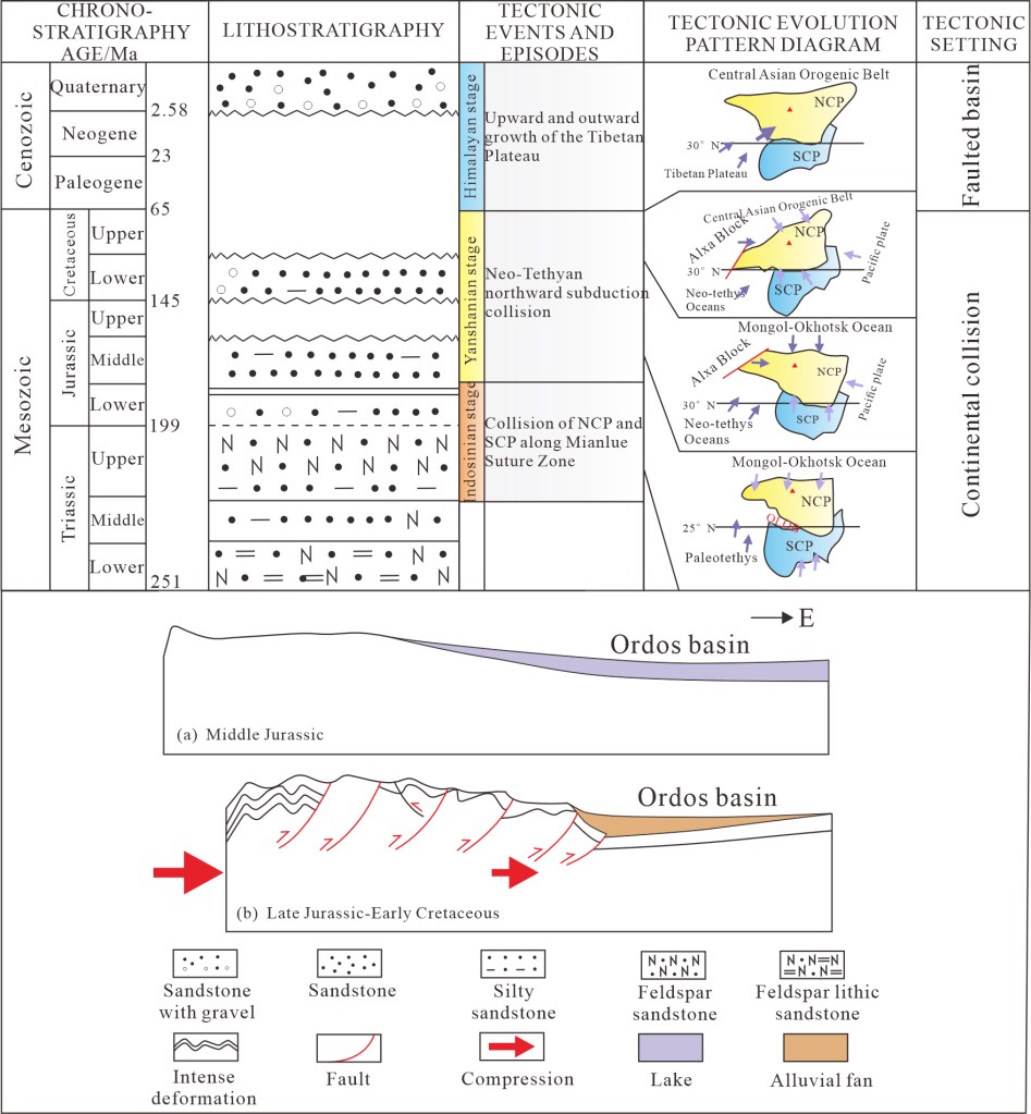 鄂尔多斯盆地的演化可以分为多个阶段,包括古生代的稳定克拉通盆地阶段、中生代的挤压变形阶段和新生代的再改造阶段。燕山期是该地区最主要的构造变形期。受燕山运动影响,鄂尔多斯盆地西缘经历了强烈的挤压变形和剥蚀,形成了大规模的逆冲断层和地层褶皱。构造应力从先前印支期的近南北向转变为燕山期的近东西向,其应力主要来自西南方向的特提斯构造域、阿拉善地块的向东挤压以及太平洋板块的向西俯冲。这与裂变径迹获得的峰值年龄170Ma、161Ma和153Ma相吻合。喜马拉雅运动期间,印度板块与欧亚板块的碰撞导致了该地区的快速剥蚀和构造变形,塑造了盆地当前的地貌。